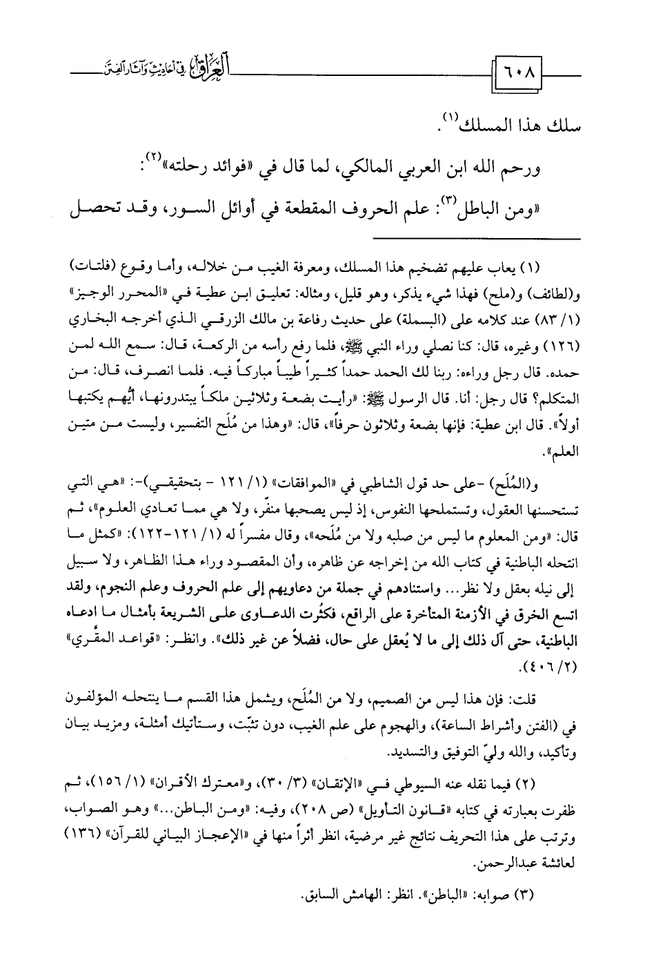 (¬1) يعاب عليهم تضخيم هذا المسلك، ومعرفة الغيب من خلاله، وأما وقوع (فلتات) و (لطائف) و (ملح) فهذا شيء يذكر، وهو قليل، ومثاله: تعليق ابن عطية في «المحرر الوجيز» (1/83) عند كلامه على (البسملة) على حديث رفاعة بن مالك الزرقي الذي أخرجه البخاري (126) وغيره، قال: كنا نصلي وراء النبي - صلى الله عليه وسلم -، فلما رفع رأسه من الركعة، قال: سمع الله لمن حمده. قال رجل وراءه: ربنا لك الحمد حمداً كثيراً طيباً مباركاً فيه. فلما انصرف، قال: من المتكلم؟ قال رجل: أنا. قال الرسول - صلى الله عليه وسلم -: «رأيت بضعة وثلاثين ملكاً يبتدرونها، أيُّهم يكتبها أولاً» . قال ابن عطية: فإنها بضعة وثلاثون حرفاً» ، قال: «وهذا من مُلَح التفسير، وليست من متين العلم» .