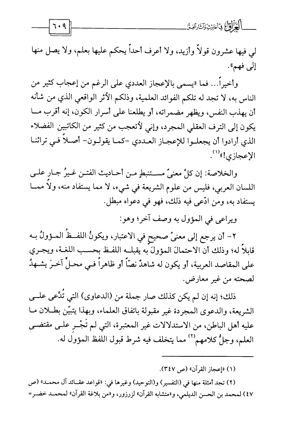 وأخيراً ... فما «يسمى بالإعجاز العددي على الرغم من إعجاب كثير من الناس به، لا تجد له تلكم الفوائد العلمية، وذلكم الأثر الواقعي الذي من شأنه أن يهذب النفس، ويظهر مضمراته، أو يطلعنا على أسرار الكون، إنه أقرب ما يكون إلى الترف العقلي المجرد، وإني لأتعجب من كثير من الكاتبين الفضلاء الذي أرادوا أن يجعلوا للإعجاز العددي -كما يقولون- أصلاً في تراثنا الإعجازي!» (¬1) .