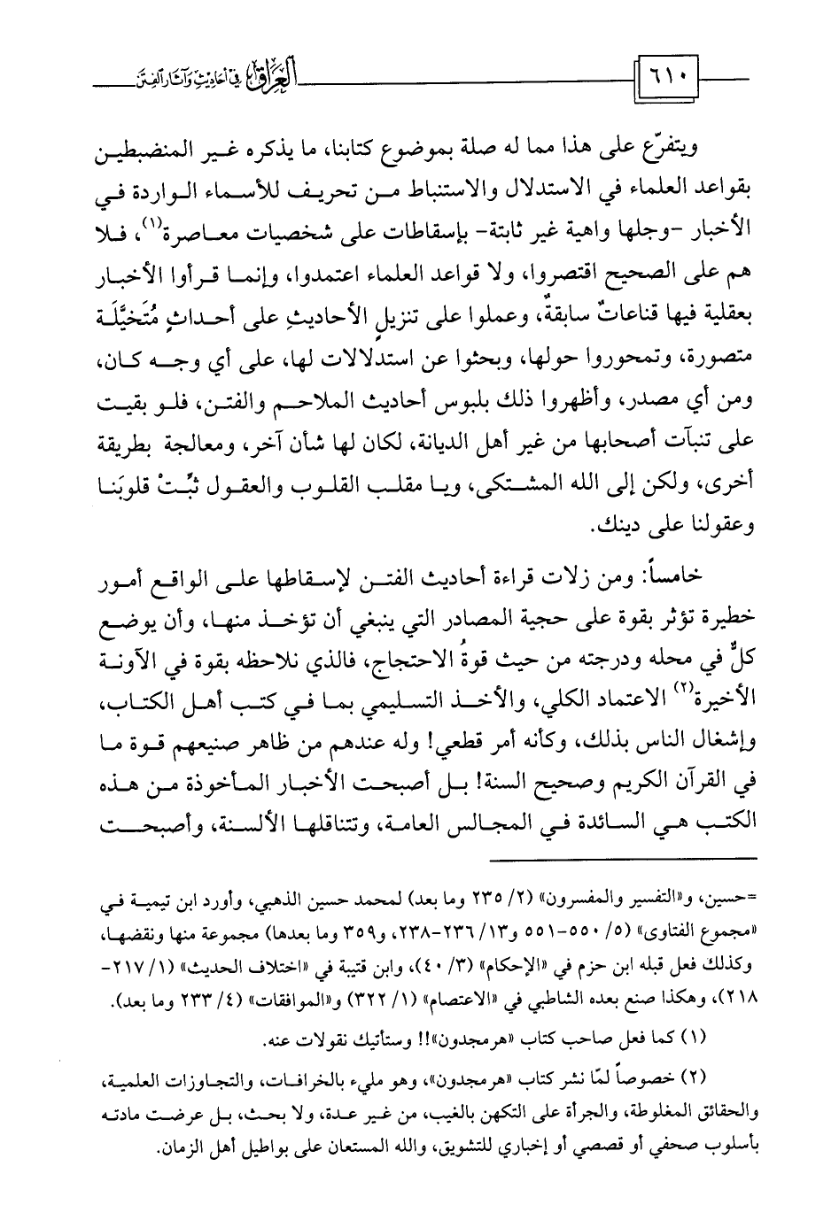 خامساً: ومن زلات قراءة أحاديث الفتن لإسقاطها على الواقع أمور خطيرة تؤثر بقوة على حجية المصادر التي ينبغي أن تؤخذ منها، وأن يوضع كلٌّ في محله ودرجته من حيث قوةُ الاحتجاج، فالذي نلاحظه بقوة في الآونة الأخيرة (¬2) الاعتماد الكلي، والأخذ التسليمي بما في كتب أهل الكتاب، وإشغال الناس بذلك، وكأنه أمر قطعي! وله عندهم من ظاهر صنيعهم قوة ما في القرآن الكريم وصحيح السنة! بل أصبحت الأخبار المأخوذة من هذه الكتب هي السائدة في المجالس العامة، وتتناقلها الألسنة، وأصبحت