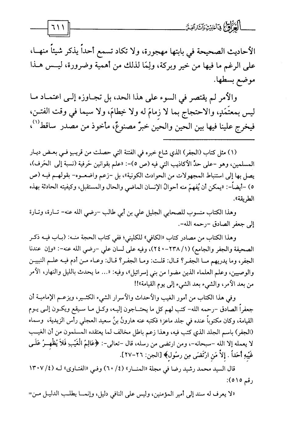 (¬1) مثل كتاب (الجفر) الذي شاع خبره في الفتنة التي حصلت من قريبٍ في بعض ديار المسلمين، وهو -على حدِّ الأكاذيب التي فيه (ص 5) -: «علم بقوانين حَرفية (نسبة إلى الحَرف) ، يصل بها إلى استنباط المجهولات من الحوادث الكونية» ، بل -زعم واضعوه- بقولهم فيه (ص 5) -أيضاً-: «يمكن أن يُفهمَ منه أحوالُ الإنسان الماضي والحال والمستقبل، وكيفيته الحادثة بهذه الطريقة» .