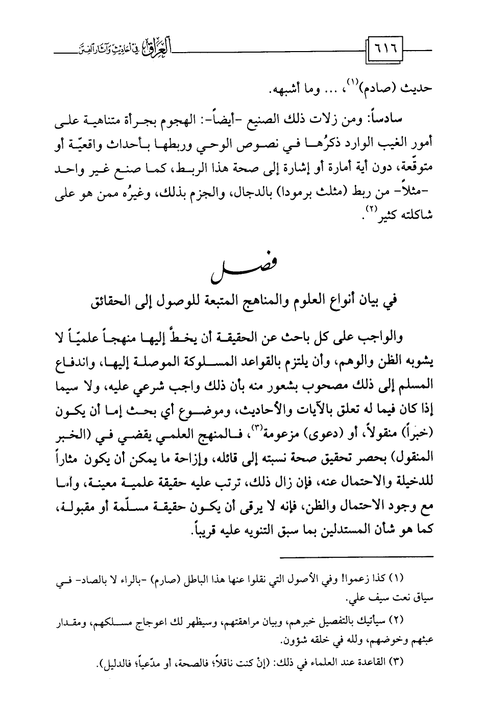 والواجب على كل باحث عن الحقيقة أن يخطَّ إليها منهجاً علميّاً لا يشوبه الظن والوهم، وأن يلتزم بالقواعد المسلوكة الموصلة إليها، واندفاع المسلم إلى ذلك مصحوب بشعور منه بأن ذلك واجب شرعي عليه، ولا سيما إذا كان فيما له تعلق بالآيات والأحاديث، وموضوع أي بحث إما أن يكون (خبراً) منقولاً، أو (دعوى) مزعومة (¬3) ، فالمنهج العلمي يقضي في (الخبر المنقول) بحصر تحقيق صحة نسبته إلى قائله، وإزاحة ما يمكن أن يكون مثاراً للدخيلة والاحتمال عنه، فإن زال ذلك، ترتب عليه حقيقة علمية معينة، وأما مع وجود الاحتمال والظن، فإنه لا يرقى أن يكون حقيقة مسلّمة أو مقبولة، كما هو شأن المستدلين بما سبق التنويه عليه قريباً.