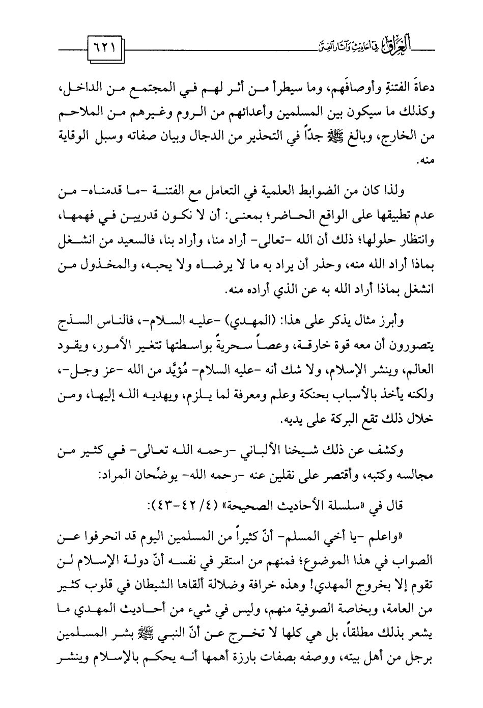 «واعلم -يا أخي المسلم- أنّ كثيراً من المسلمين اليوم قد انحرفوا عن الصواب في هذا الموضوع؛ فمنهم من استقر في نفسه أنّ دولة الإسلام لن تقوم إلا بخروج المهدي! وهذه خرافة وضلالة ألقاها الشيطان في قلوب كثير من العامة، وبخاصة الصوفية منهم، وليس في شيء من أحاديث المهدي ما يشعر بذلك مطلقاً، بل هي كلها لا تخرج عن أنّ النبي صلى الله عليه وسلم بشر المسلمين برجل من أهل بيته، ووصفه بصفات بارزة أهمها أنه يحكم بالإسلام وينشر