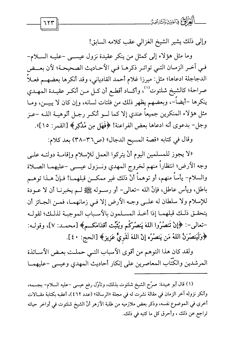 (¬1) قال أبو عبيدة: صرّح الشيخ شلتوت بذلك، وتأوّل رفع عيسى -عليه السلام- بجسمه، وأنكر نزوله آخر الزمان في مقالة نشرت له في مجلة «الرسالة» (عدد 462) ، أعقبه بكتابة مقالات أخرى في الموضوع نفسه، وذكر بعض ملازميه من طلبة الأزهر أنّ الشيخ شلتوت في أواخر حياته تراجع عن ذلك، وأحرق كل ما كتبه في ذلك.