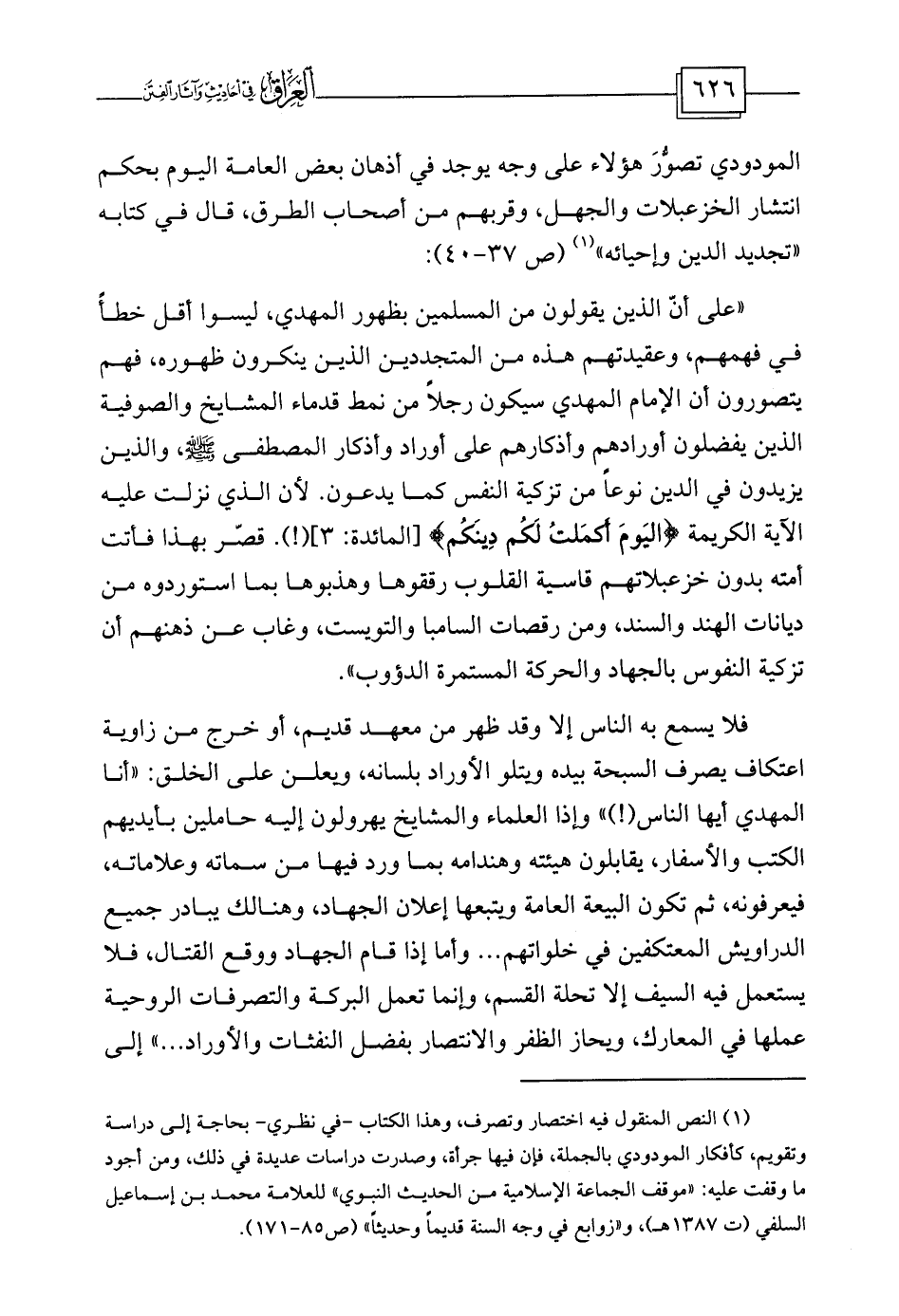 «على أنّ الذين يقولون من المسلمين بظهور المهدي، ليسوا أقل خطأً في فهمهم، وعقيدتهم هذه من المتجددين الذين ينكرون ظهوره، فهم يتصورون أن الإمام المهدي سيكون رجلاً من نمط قدماء المشايخ والصوفية الذين يفضلون أورادهم وأذكارهم على أوراد وأذكار المصطفى صلى الله عليه وسلم، والذين يزيدون في الدين نوعاً من تزكية النفس كما يدعون. لأن الذي نزلت عليه الآية الكريمة {اليَومَ أَكمَلتُ لَكُم دِينَكُم} [المائدة: 3] (!) . قصّر بهذا فأتت أمته بدون خزعبلاتهم قاسية القلوب رققوها وهذبوها بما استوردوه من ديانات الهند والسند، ومن رقصات السامبا والتويست، وغاب عن ذهنهم أن تزكية النفوس بالجهاد والحركة المستمرة الدؤوب» .