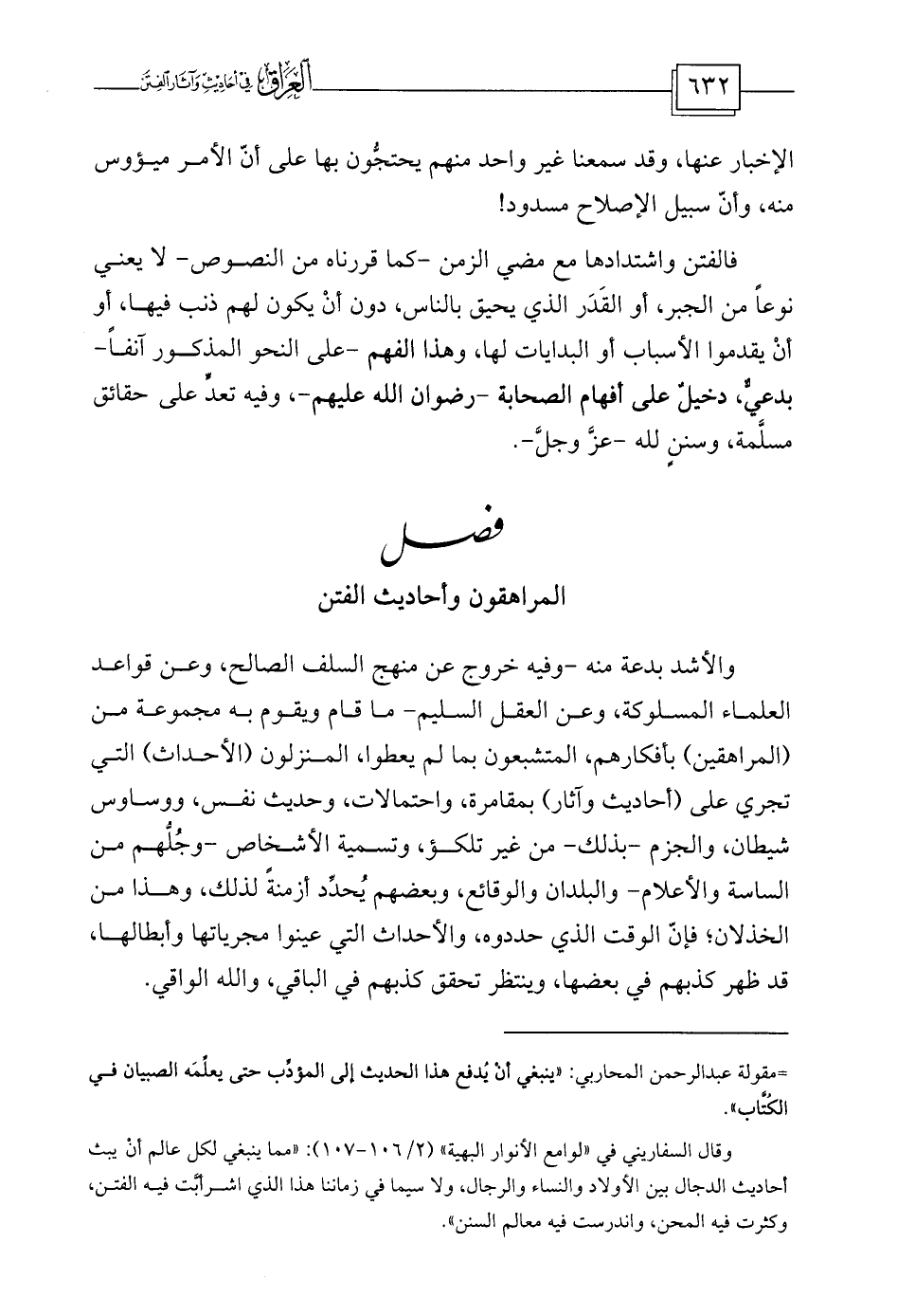 وقال السفاريني في «لوامع الأنوار البهية» (2/106-107) : «مما ينبغي لكل عالم أنْ يبث أحاديث الدجال بين الأولاد والنساء والرجال، ولا سيما في زماننا هذا الذي اشرأبَّت فيه الفتن، وكثرت فيه المحن، واندرست فيه معالم السنن» .