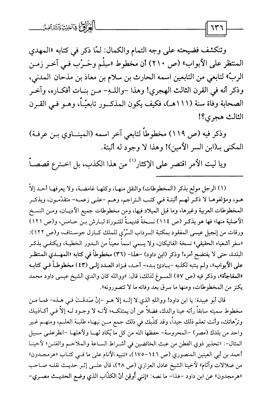 (¬1) الرجل مولع بذكر (المخطوطات) والنقل منها، وكلها غامضة، ولا يعرفها أحد إلاّ هو، ومؤلفوها لا ذكر لهم ألبتة في كتب التراجم، وهم -على زعمه- متقدّمون، ويذكر المخطوطات العربية وغيرها، وما قبل الميلاد فيها، ومن مخطوطات جميع الأديان، ومن النسخ الأصلية منها؛ فها هو يذكر (ص 114) نسخةً قديمةً للتوراة لبارش بن حامس، و (ص 121) ورقات من إنجيل عيسى المفقود بمكتبة السرداب السّرّي للملك كارل جوستاف، و (ص 122) : «سفر أشعياء الحقيقي» نسخة الفاتيكان، ولا يسمي اسماً معيناً من الدور الخطية، ويكتفي بذكر البلدة، حتى لا يفتضح أمره! وذكر (ابن داود) -هذا- (36) مخطوطاً في كتابه «المهدي المنتظر على الأبواب» ، ولم ينتبه لكذبه -بادئ بدء- أحد، فزاد العدد إلى (43) مخطوطاً في كتابه «المفاجأة» ، وذكر فيه (ص 57) المسوغ لذلك، قال: «ووالله كان والدي الشيخ عيسى داود محمد يكنز من المخطوطات، ومنها ما سرق بعد وفاته ما لا تتصورونه» .