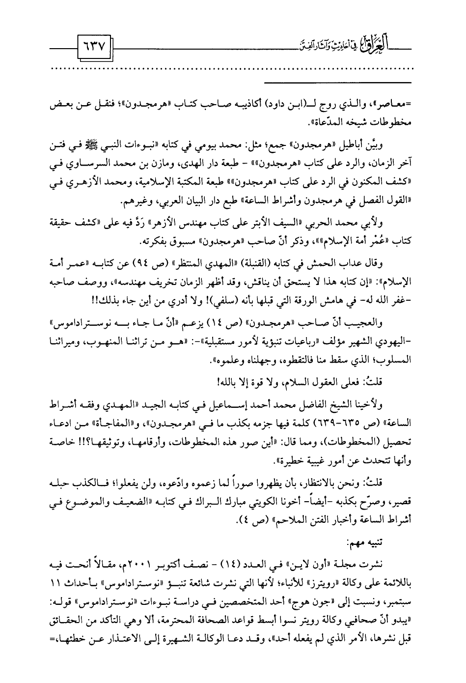 ولأخينا الشيخ الفاضل محمد أحمد إسماعيل في كتابه الجيد «المهدي وفقه أشراط الساعة» (ص 635-639) كلمة فيها جزمه بكذب ما في «هرمجدون» ، و «المفاجأة» من ادعاء تحصيل (المخطوطات) ، ومما قال: «أين صور هذه المخطوطات، وأرقامها، وتوثيقها؟!! خاصة وأنها تتحدث عن أمور غيبية خطيرة» .