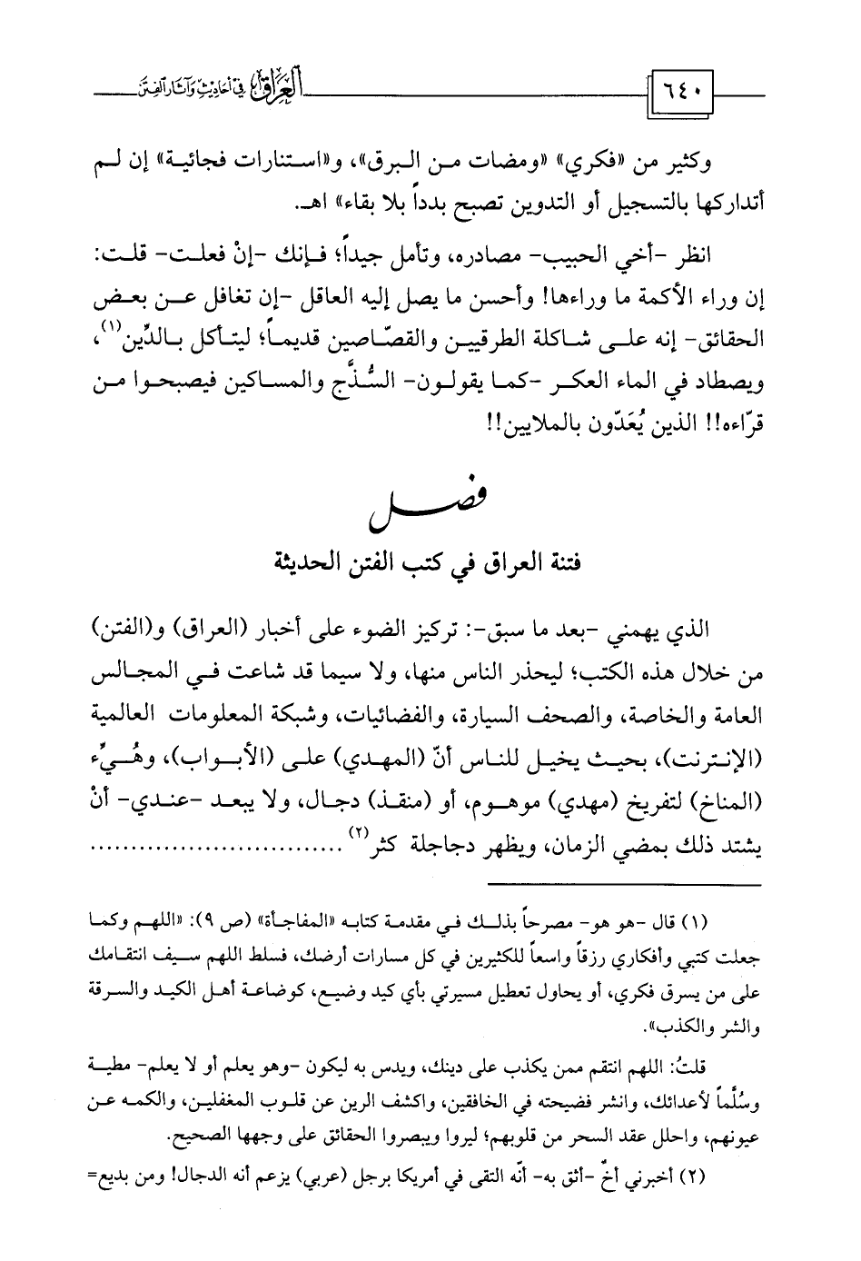الذي يهمني -بعد ما سبق-: تركيز الضوء على أخبار (العراق) و (الفتن) من خلال هذه الكتب؛ ليحذر الناس منها، ولا سيما قد شاعت في المجالس العامة والخاصة، والصحف السيارة، والفضائيات، وشبكة المعلومات العالمية (الإنترنت) ، بحيث يخيل للناس أنّ (المهدي) على (الأبواب) ، وهُيِّء (المناخ) لتفريخ (مهدي) موهوم، أو (منقذ) دجال، ولا يبعد -عندي- أنْ يشتد ذلك بمضي الزمان، ويظهر دجاجلة كثر (¬2) ...............................