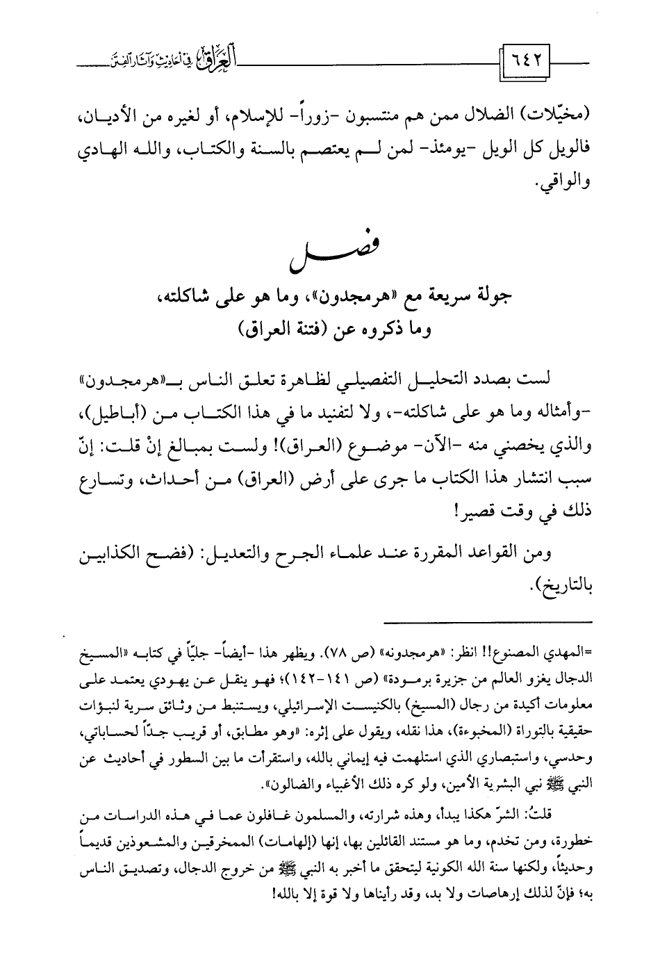 لست بصدد التحليل التفصيلي لظاهرة تعلق الناس بـ «هرمجدون» ... -وأمثاله وما هو على شاكلته-، ولا لتفنيد ما في هذا الكتاب من (أباطيل) ، والذي يخصني منه -الآن- موضوع (العراق) ! ولست بمبالغ إنْ قلت: إنّ سبب انتشار هذا الكتاب ما جرى على أرض (العراق) من أحداث، وتسارع ذلك في وقت قصير!