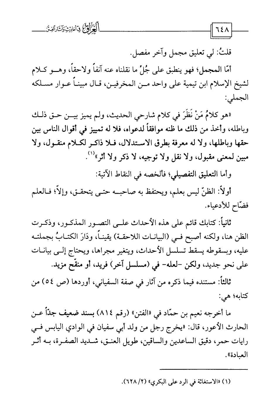 ثانياً: كتابك قائم على هذه الأحداث على التصور المذكور، وذكرت الظن هنا، ولكنه أصبح في (البيانات اللاحقة) يقيناً، ودَارَ الكتابُ بجملته عليه، وبسقوطه يسقط تسلسل الأحداث، ويتغير مجراها، ويحتاج إلى بيانات على نحو جديد، ولكن -لعله- في (مسلسل آخر) فريد، أو منقّح مزيد.