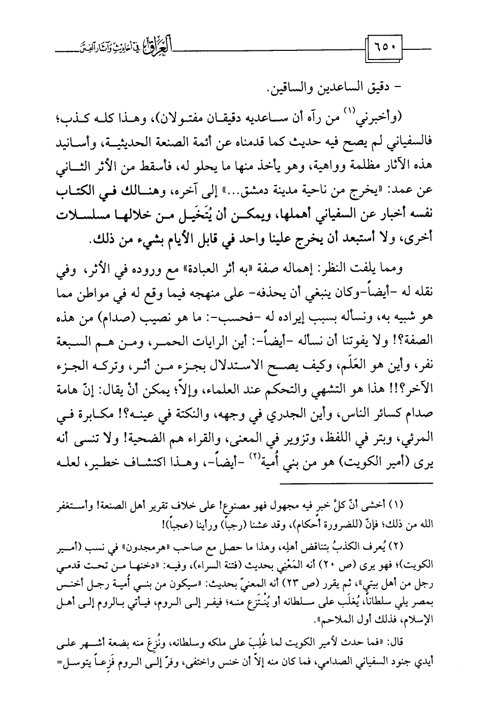 ومما يلفت النظر: إهماله صفة «به أثر العبادة» مع وروده في الأثر، وفي نقله له -أيضاً-وكان ينبغي أن يحذفه- على منهجه فيما وقع له في مواطن مما هو شبيه به، ونسأله بسبب إيراده له -فحسب-: ما هو نصيب (صدام) من هذه الصفة؟! ولا يفوتنا أن نسأله -أيضاً-: أين الرايات الحمر، ومن هم السبعة نفر، وأين هو العَلَم، وكيف يصح الاستدلال بجزء من أثر، وتركه الجزء الآخر؟!! هذا هو التشهي والتحكم عند العلماء، وإلاّ؛ يمكن أنْ يقال: إنّ هامة صدام كسائر الناس، وأين الجدري في وجهه، والنكتة في عينه؟! مكابرة في المرئي، وبتر في اللفظ، وتزوير في المعنى، والقراء هم الضحية! ولا تنسى أنه يرى (أمير الكويت) هو من بني أُمية (¬2)