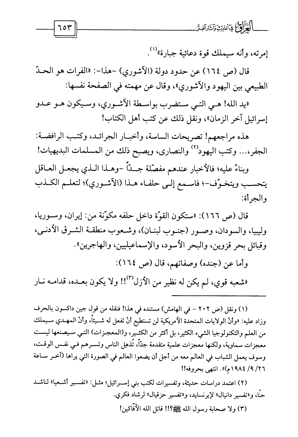 (¬1) ونقل (ص 202 - في الهامش) مستنده في هذا! فنقله من قول جين داكسون بالحرف وزاد عليه: «وأنّ الولايات المتحدة الأمريكية لن تستطيع أنْ تفعل له شيئاً، وأنّ المهدي سيملك من العلم والتكنولوجيا الشيء الكثير، بل أكثر من الكثير، و (المعجزات) التي سيصنعها ليست معجزات سماوية، ولكنها معجزات علمية متقدمة جدّاً، تُذهِل الناس وتسرهم في نفس الوقت، وسوف يعمل الشباب في العالم معه من أجل أن يضعوا العالم في الصورة التي يراها (آخر ساعة 26/9/1984م) » . انتهى بحروفه!!