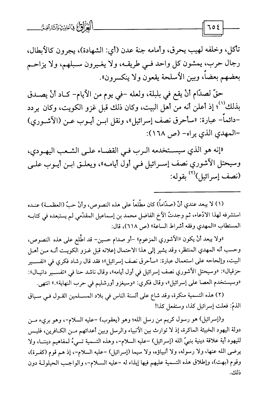 «ولا يبعد أنْ يكون «الآشوري المزعوم» -أو صدام حسين- قد اطَّلع على هذه النصوص، وحسب أنه المهدي المنتظر، وقد يشير إلى هذا الاحتمال إعلانه قبل غزو الكويت أنه من أهل البيت، وإلحاحه على استعمال عبارة: «سأحرق نصف إسرائيل» ؛ فقد قال رشاد فكري في «تفسير حزقيال» : «وسيحتل الآشوري نصف إسرائيل في أول أيامه» ، وقال ناشد حنا في «تفسير دانيال» : «وسيستخدم العصا على إسرائيل» ، وقال فكري: «وسيغزو أورشليم في حرب النهاية» .» انتهى.