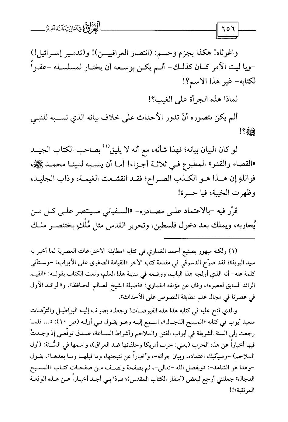 بصاحب الكتاب الجيد «القضاء والقدر» المطبوع في ثلاثة أجزاء! أما أن ينسبه لنبينا محمد صلى الله عليه وسلم، فواللهِ إن هذا هو الكذب الصراح؛ فقد انقشعت الغيمة، وذاب الجليد، وظهرت الخيبة، فيا حسرة!
