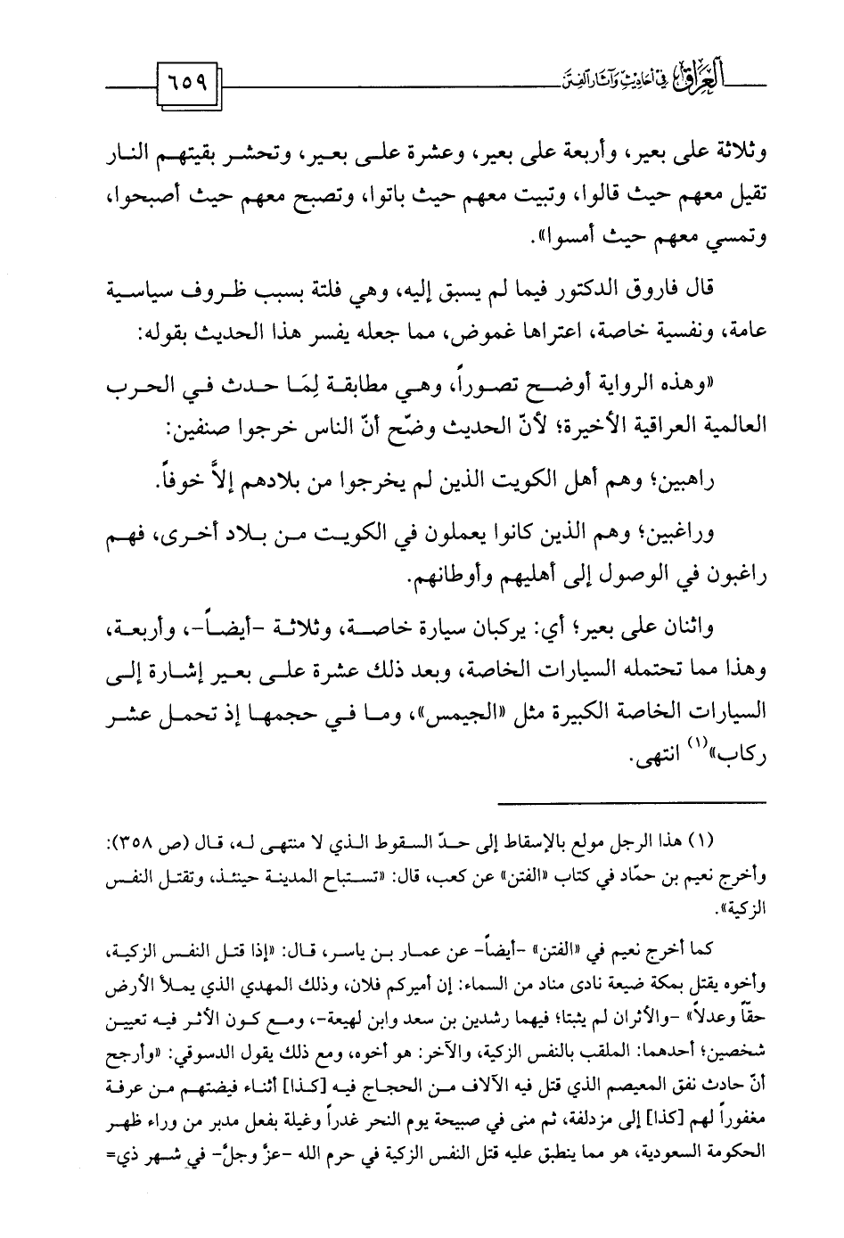 (¬1) هذا الرجل مولع بالإسقاط إلى حدّ السقوط الذي لا منتهى له، قال (ص 358) : وأخرج نعيم بن حمّاد في كتاب «الفتن» عن كعب، قال: «تستباح المدينة حينئذ، وتقتل النفس الزكية» .