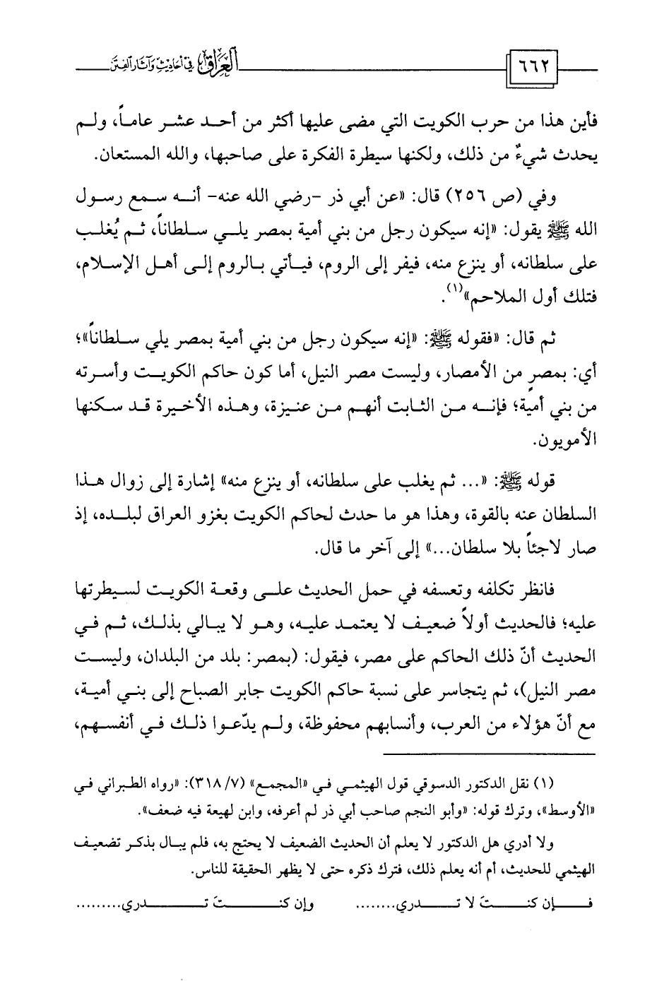 فانظر تكلفه وتعسفه في حمل الحديث على وقعة الكويت لسيطرتها عليه؛ فالحديث أولاً ضعيف لا يعتمد عليه، وهو لا يبالي بذلك، ثم في الحديث أنّ ذلك الحاكم على مصر، فيقول: (بمصر: بلد من البلدان، وليست مصر النيل) ، ثم يتجاسر على نسبة حاكم الكويت جابر الصباح إلى بني أمية، مع أنّ هؤلاء من العرب، وأنسابهم محفوظة، ولم يدّعوا ذلك في أنفسهم،