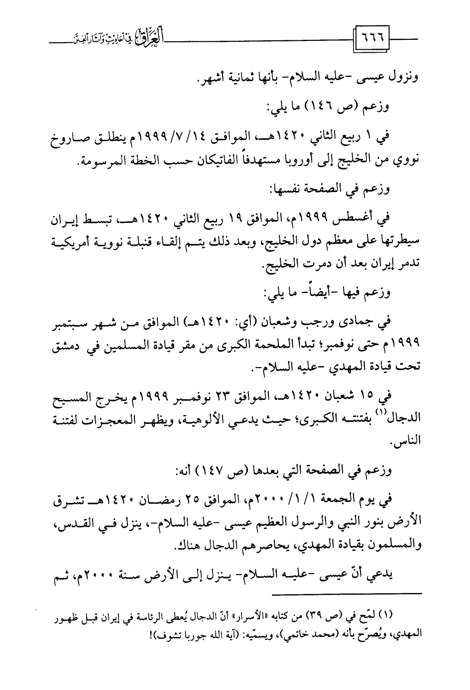 (¬1) لمّح في (ص 39) من كتابه «الأسرار» أنّ الدجال يُعطى الرئاسة في إيران قبل ظهور المهدي، ويُصرّح بأنه (محمد خاتمي) ، ويسمّيه: (آية الله جوربا تشوف) !