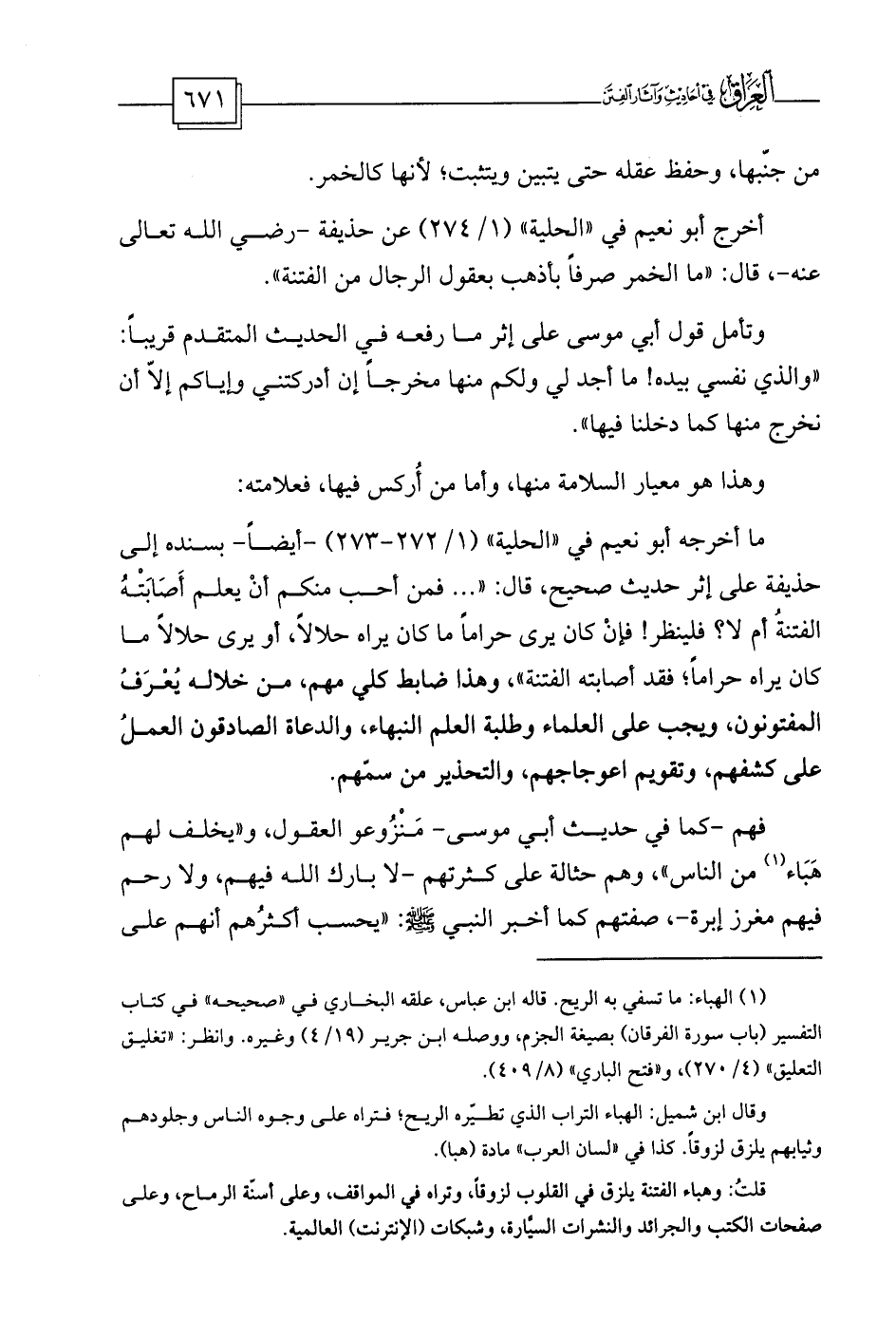 ما أخرجه أبو نعيم في «الحلية» (1/272-273) -أيضاً- بسنده إلى حذيفة على إثر حديث صحيح، قال: « ... فمن أحب منكم أنْ يعلم أَصَابَتْهُ الفتنةُ أم لا؟ فلينظر! فإنْ كان يرى حراماً ما كان يراه حلالاً، أو يرى حلالاً ما كان يراه حراماً؛ فقد أصابته الفتنة» ، وهذا ضابط كلي مهم، من خلاله يُعْرَفُ المفتونون، ويجب على العلماء وطلبة العلم النبهاء، والدعاة الصادقون العملُ على كشفهم، وتقويم اعوجاجهم، والتحذير من سمّهم.