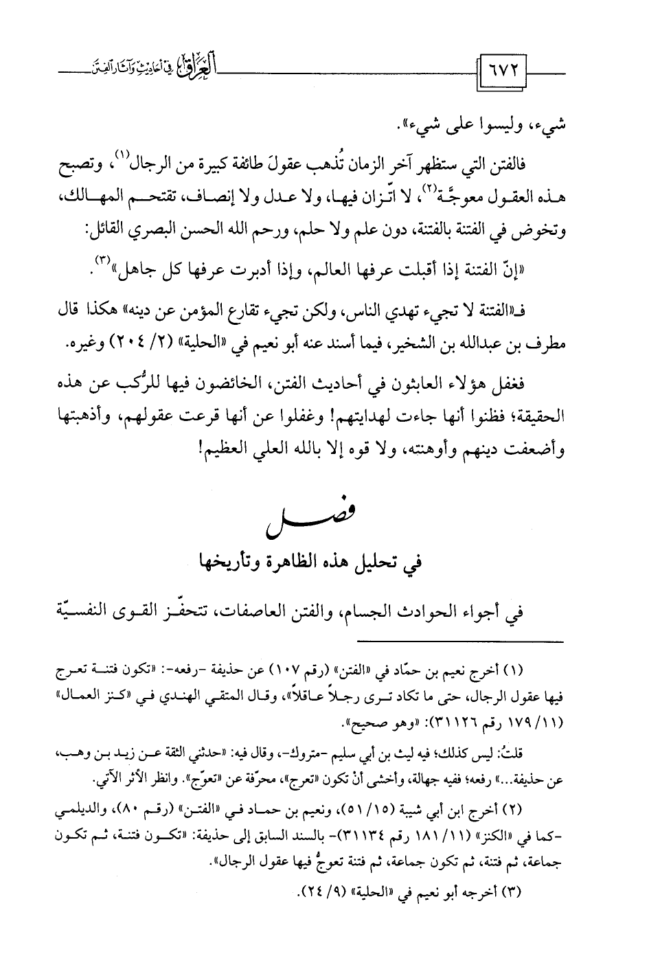 (¬1) أخرج نعيم بن حمّاد في «الفتن» (رقم 107) عن حذيفة -رفعه-: «تكون فتنة تعرج فيها عقول الرجال، حتى ما تكاد ترى رجلاً عاقلاً» ، وقال المتقي الهندي في «كنز العمال» (11/179 رقم 31126) : «وهو صحيح» .