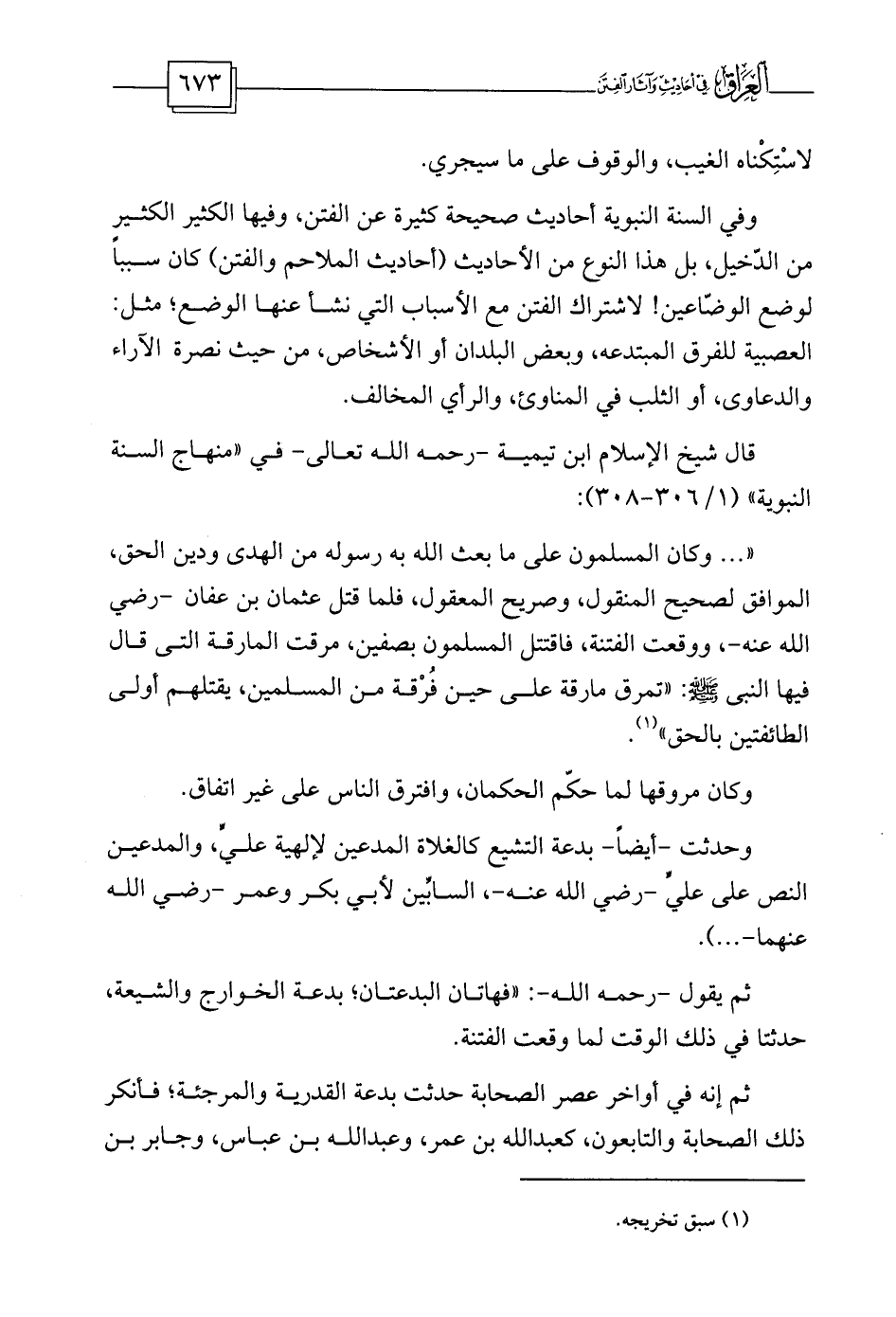 « ... وكان المسلمون على ما بعث الله به رسوله من الهدى ودين الحق، الموافق لصحيح المنقول، وصريح المعقول، فلما قتل عثمان بن عفان -رضي الله عنه-، ووقعت الفتنة، فاقتتل المسلمون بصفين، مرقت المارقة التى قال فيها النبى صلى الله عليه وسلم: «تمرق مارقة على حين فُرْقة من المسلمين، يقتلهم أولى الطائفتين بالحق» (¬1) .