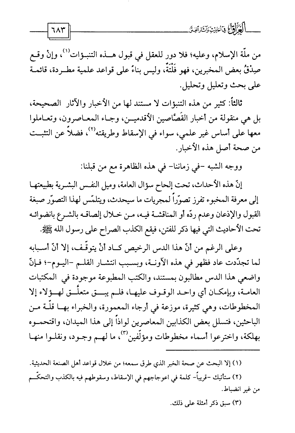 من ملّة الإسلام، وعليه؛ فلا دور للعقل في قبول هذه التنبؤات (¬1) ، وإنْ وقع صِدْقُ بعض المخبرين، فهو فَلْتَةٌ، وليس بناءً على قواعد علمية مطردة، قائمة على بحث وتعليل وتحليل.