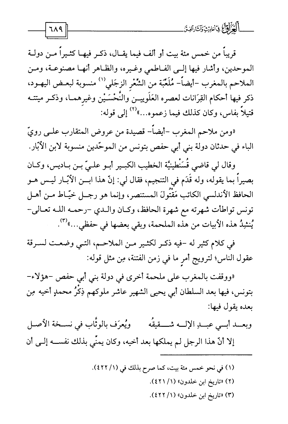 «ووقفت بالمغرب على ملحمة أخرى في دولة بني أبي حفص -هؤلاء- بتونس، فيها بعد السلطان أبي يحيى الشهير عاشر ملوكهم ذِكْرُ محمدٍ أخيه مِن بعده يقول فيها: