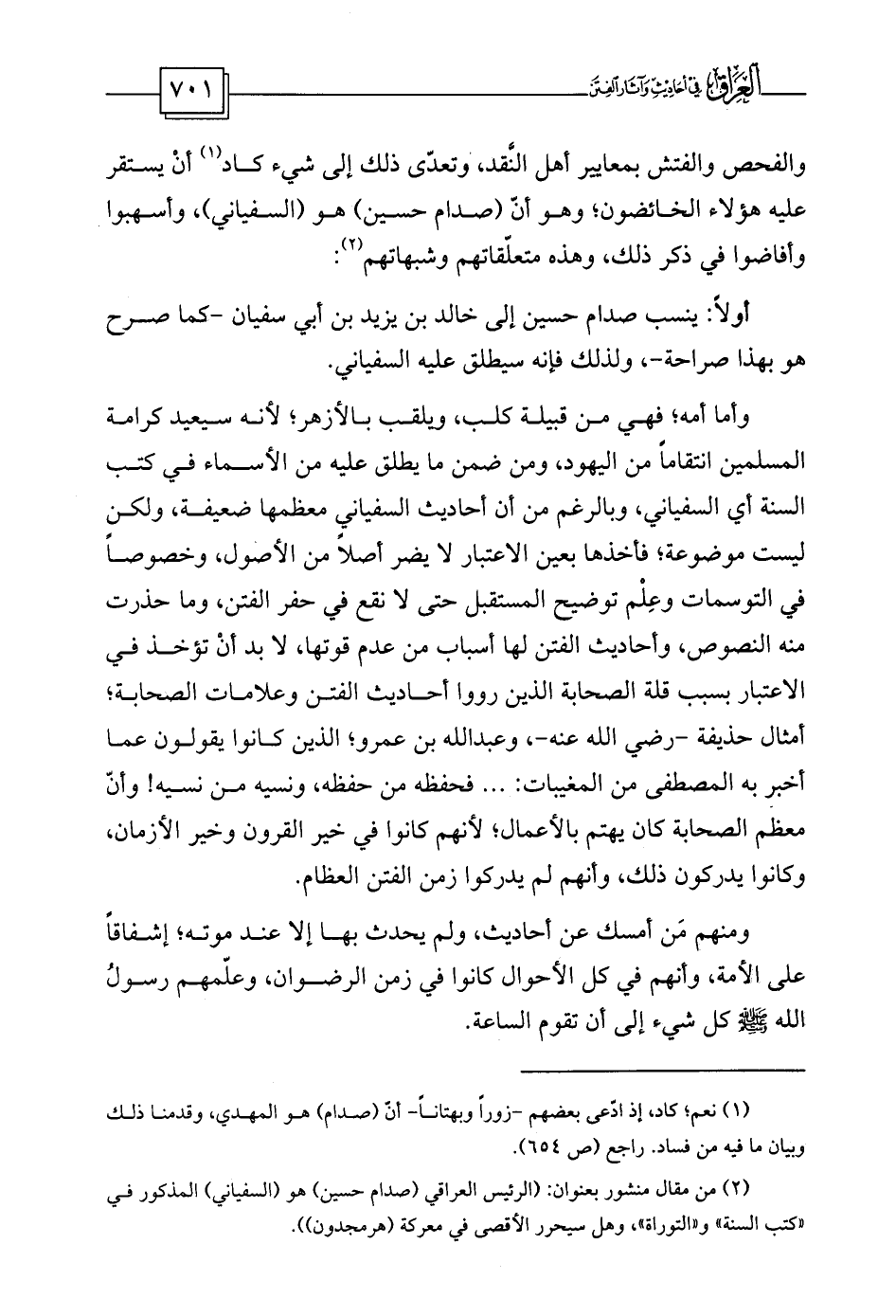 والفحص والفتش بمعايير أهل النَّقد، وتعدّى ذلك إلى شيء كاد (¬1) أنْ يستقر عليه هؤلاء الخائضون؛ وهو أنّ (صدام حسين) هو (السفياني) ، وأسهبوا وأفاضوا في ذكر ذلك، وهذه متعلّقاتهم وشبهاتهم (¬2) :