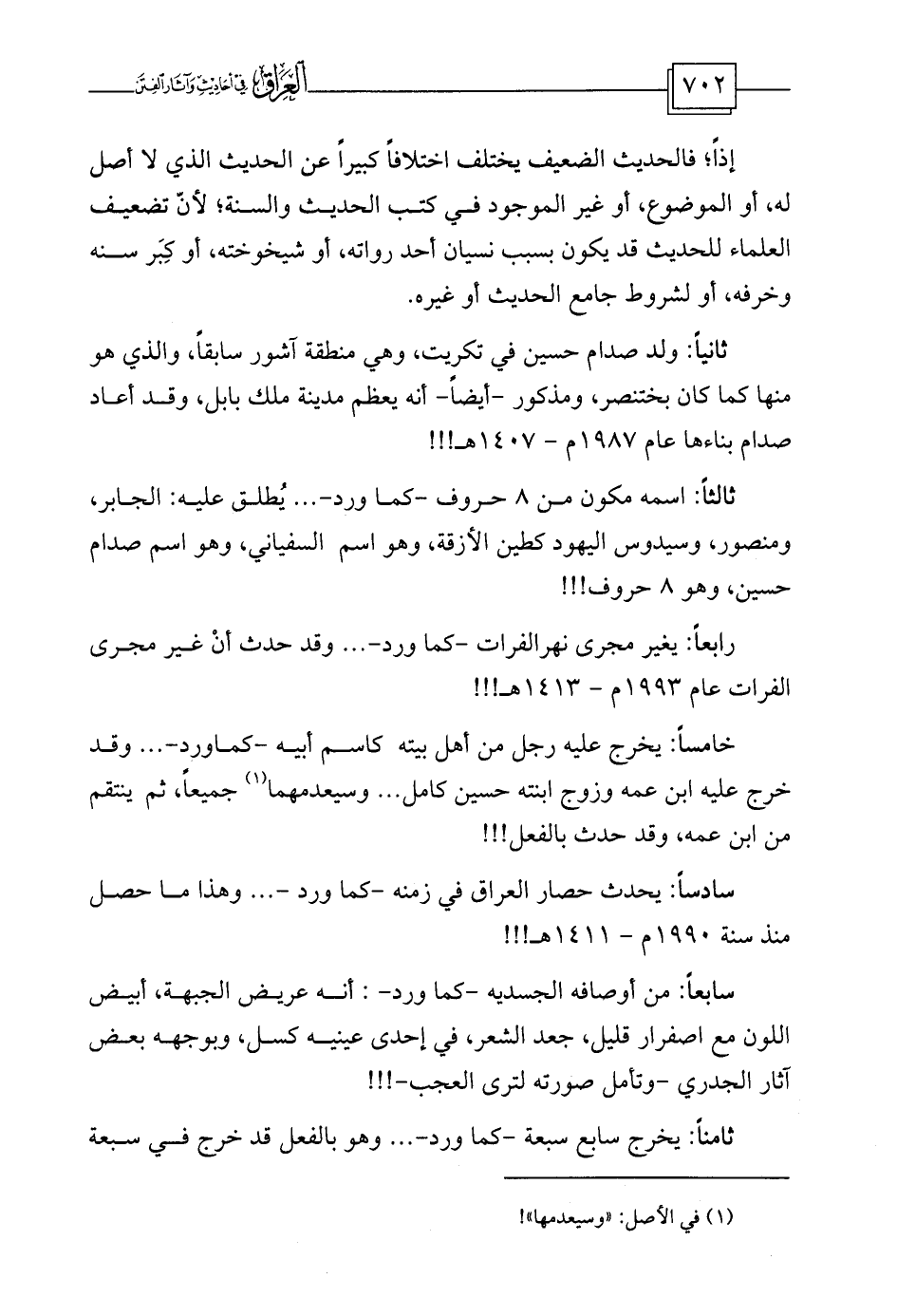 ثانياً: ولد صدام حسين في تكريت، وهي منطقة آشور سابقاً، والذي هو منها كما كان بختنصر، ومذكور -أيضاً- أنه يعظم مدينة ملك بابل، وقد أعاد صدام بناءها عام 1987م - 1407هـ!!!