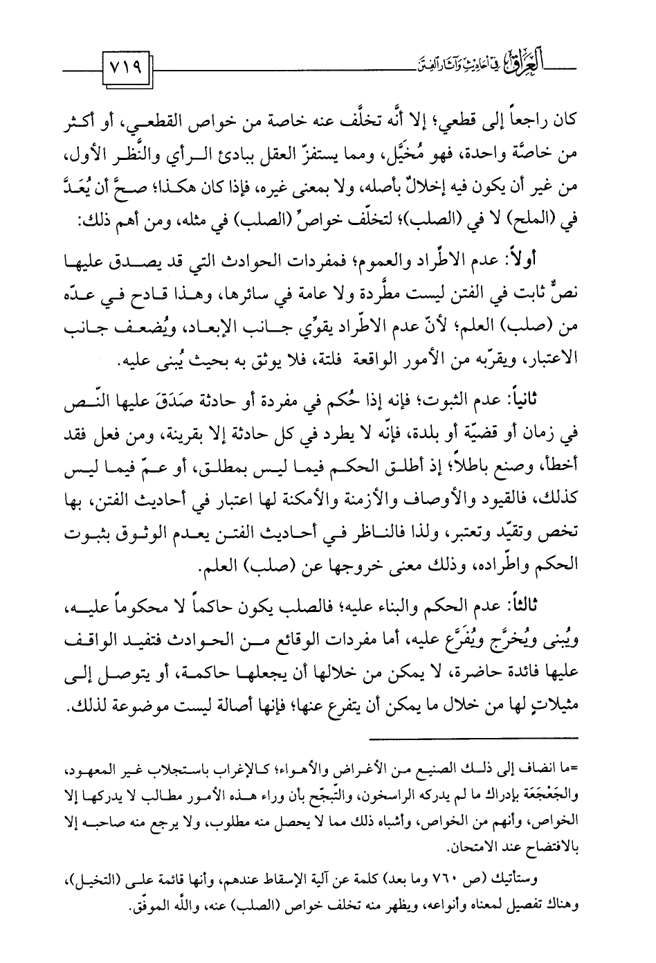 ثانياً: عدم الثبوت؛ فإنه إذا حُكم في مفردة أو حادثة صَدَقَ عليها النّص في زمان أو قضيّة أو بلدة، فإنّه لا يطرد في كل حادثة إلا بقرينة، ومن فعل فقد أخطأ، وصنع باطلاً؛ إذ أطلق الحكم فيما ليس بمطلق، أو عمّ فيما ليس كذلك، فالقيود والأوصاف والأزمنة والأمكنة لها اعتبار في أحاديث الفتن، بها تخص وتقيّد وتعتبر، ولذا فالناظر في أحاديث الفتن يعدم الوثوق بثبوت الحكم واطّراده، وذلك معنى خروجها عن (صلب) العلم.