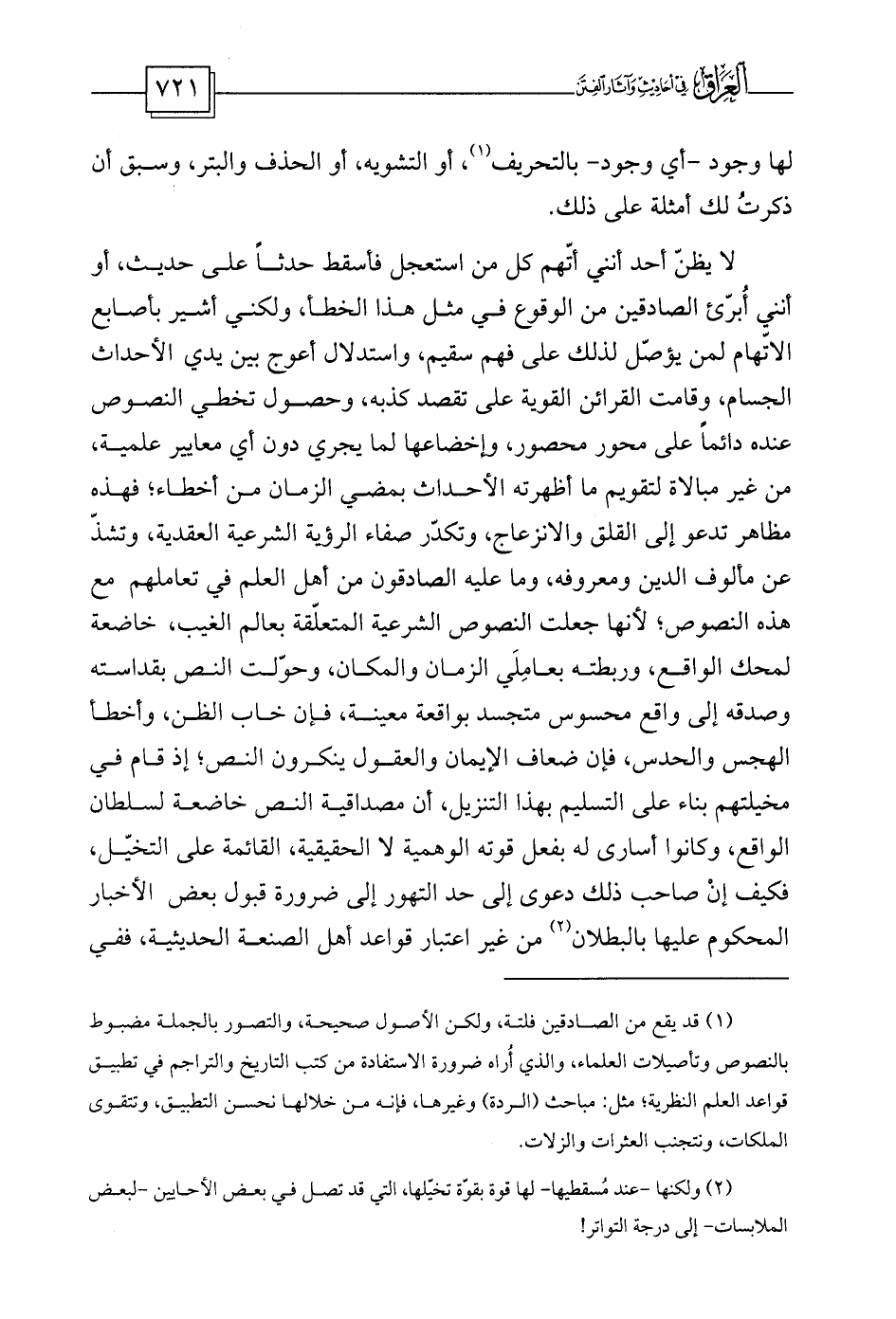 لا يظنّ أحد أنني أتّهم كل من استعجل فأسقط حدثاً على حديث، أو أنني أُبرّئ الصادقين من الوقوع في مثل هذا الخطأ، ولكني أشير بأصابع الاتّهام لمن يؤصّل لذلك على فهم سقيم، واستدلال أعوج بين يدي الأحداث الجسام، وقامت القرائن القوية على تقصد كذبه، وحصول تخطي النصوص عنده دائماً على محور محصور، وإخضاعها لما يجري دون أي معايير علمية، من غير مبالاة لتقويم ما أظهرته الأحداث بمضي الزمان من أخطاء؛ فهذه مظاهر تدعو إلى القلق والانزعاج، وتكدّر صفاء الرؤية الشرعية العقدية، وتشذّ عن مألوف الدين ومعروفه، وما عليه الصادقون من أهل العلم في تعاملهم مع هذه النصوص؛ لأنها جعلت النصوص الشرعية المتعلّقة بعالم الغيب، خاضعة لمحك الواقع، وربطته بعامِلَي الزمان والمكان، وحوّلت النص بقداسته وصدقه إلى واقع محسوس متجسد بواقعة معينة، فإن خاب الظن، وأخطأ الهجس والحدس، فإن ضعاف الإيمان والعقول ينكرون النص؛ إذ قام في مخيلتهم بناء على التسليم بهذا التنزيل، أن مصداقية النص خاضعة لسلطان الواقع، وكانوا أسارى له بفعل قوته الوهمية لا الحقيقية، القائمة على التخيّل، فكيف إنْ صاحب ذلك دعوى إلى حد التهور إلى ضرورة قبول بعض الأخبار المحكوم عليها بالبطلان (¬2) من غير اعتبار قواعد أهل الصنعة الحديثية، ففي