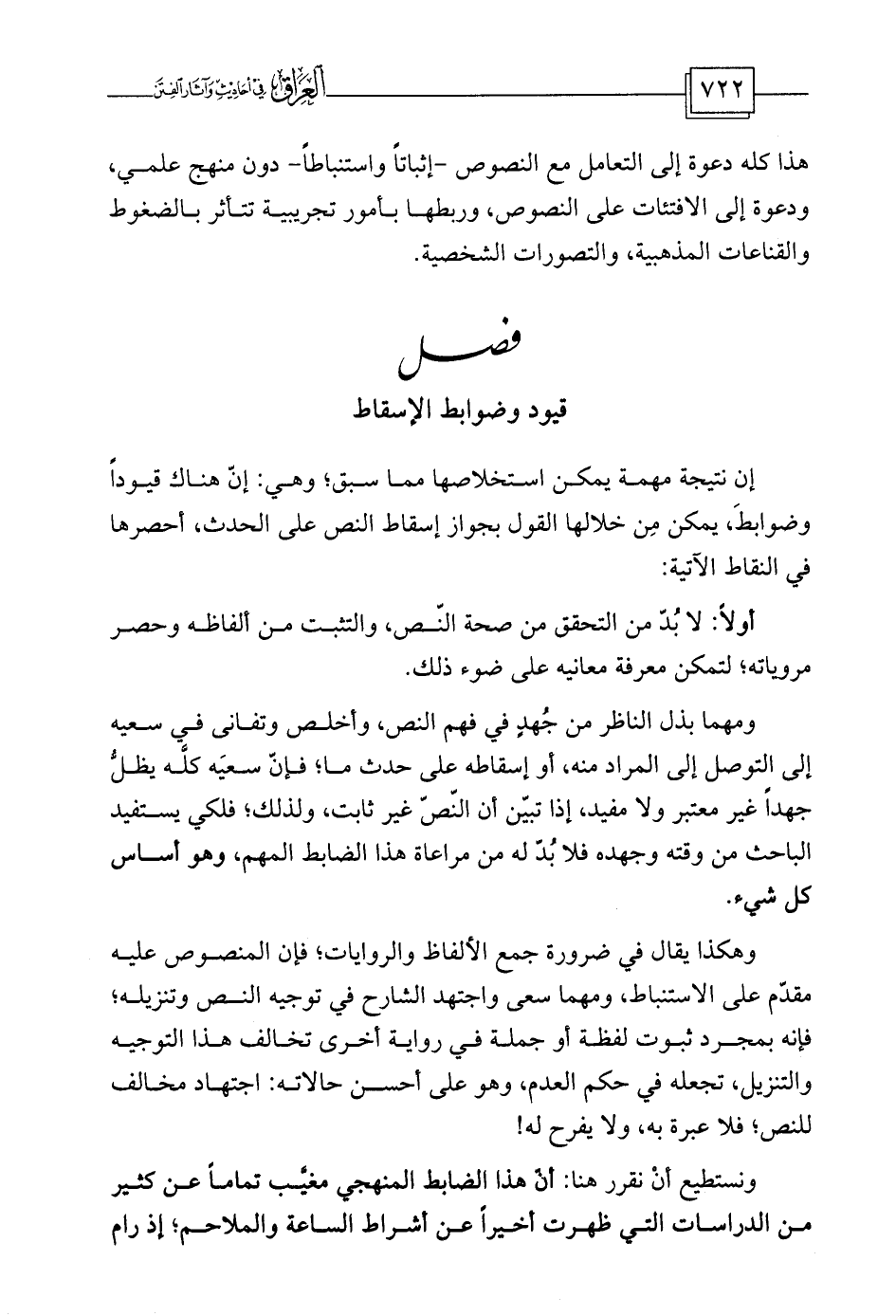 هذا كله دعوة إلى التعامل مع النصوص -إثباتاً واستنباطاً- دون منهج علمي، ودعوة إلى الافتئات على النصوص، وربطها بأمور تجريبية تتأثر بالضغوط والقناعات المذهبية، والتصورات الشخصية.