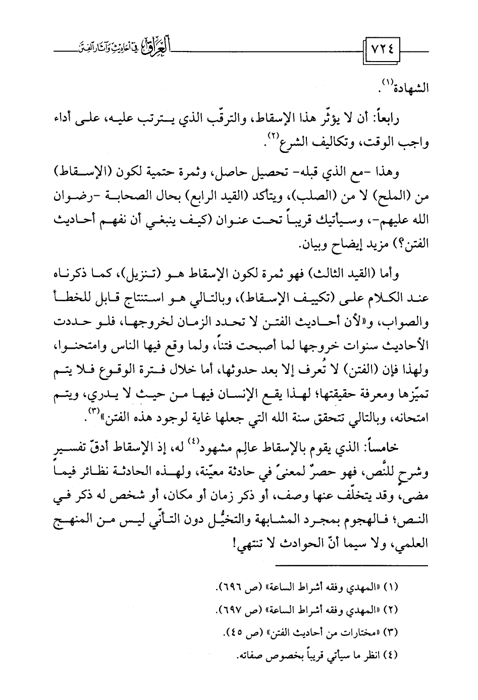 وهذا -مع الذي قبله- تحصيل حاصل، وثمرة حتمية لكون (الإسقاط) من (الملح) لا من (الصلب) ، ويتأكد (القيد الرابع) بحال الصحابة -رضوان الله عليهم-، وسيأتيك قريباً تحت عنوان (كيف ينبغي أن نفهم أحاديث الفتن؟) مزيد إيضاح وبيان.