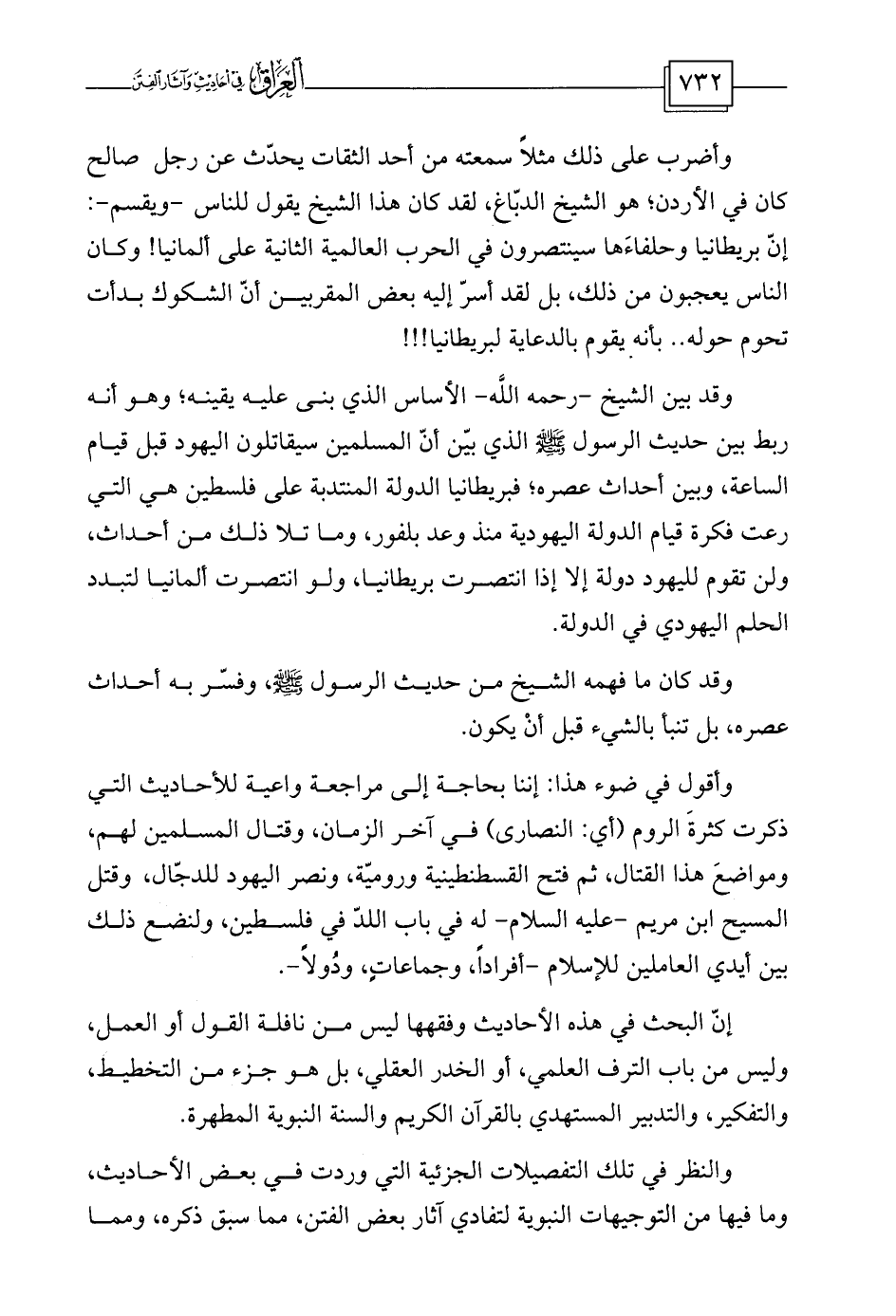 وأقول في ضوء هذا: إننا بحاجة إلى مراجعة واعية للأحاديث التي ذكرت كثرةَ الروم (أي: النصارى) في آخر الزمان، وقتال المسلمين لهم، ومواضعَ هذا القتال، ثم فتح القسطنطينية وروميّة، ونصر اليهود للدجّال، وقتل المسيح ابن مريم -عليه السلام- له في باب اللدّ في فلسطين، ولنضع ذلك بين أيدي العاملين للإسلام -أفراداً، وجماعاتٍ، ودُولاً-.