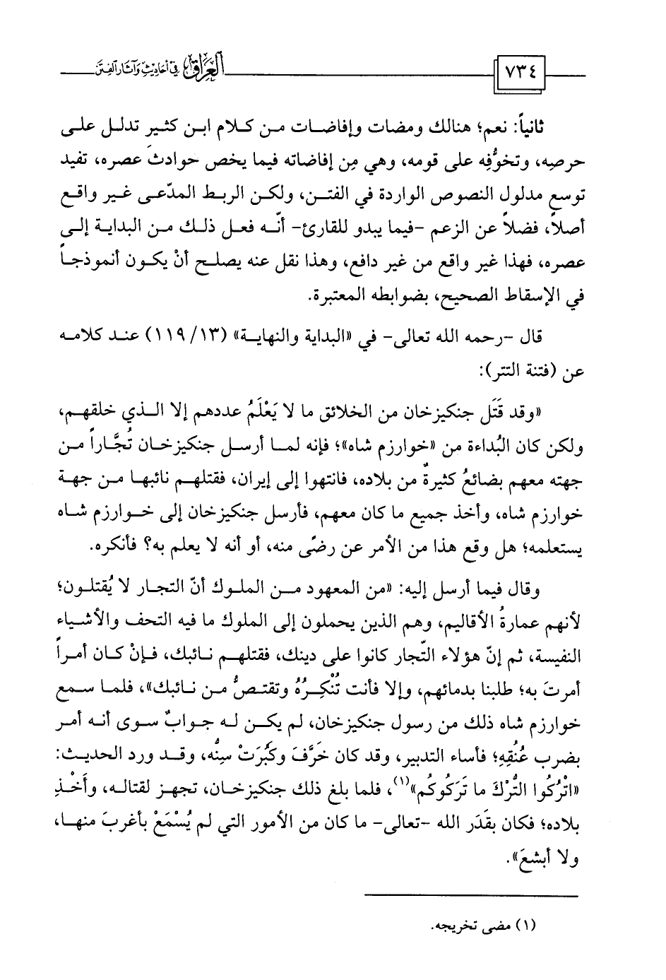 ثانياً: نعم؛ هنالك ومضات وإفاضات من كلام ابن كثير تدلل على حرصِه، وتخوُّفِه على قومه، وهي مِن إفاضاته فيما يخص حوادثَ عصره، تفيد توسع مدلول النصوص الواردة في الفتن، ولكن الربط المدّعى غير واقع أصلاً، فضلاً عن الزعم -فيما يبدو للقارئ- أنّه فعل ذلك من البداية إلى عصره، فهذا غير واقع من غير دافع، وهذا نقل عنه يصلح أنْ يكون أنموذجاً في الإسقاط الصحيح، بضوابطه المعتبرة.