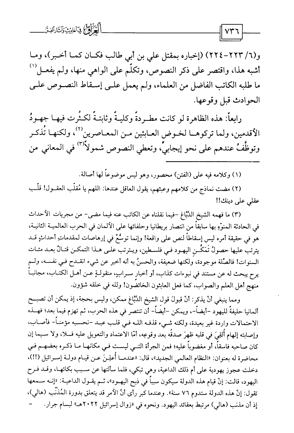 (¬3) ما فهمه الشيخ الدَّبَّاغ -فيما نقلناه عن الكاتب عنه فيما مضى- من مجريات الأحداث في الحادثة المنوّهِ بها سابقاً من انتصار بريطانيا وحلفائها على الألمان في الحرب العالمية الثانية، هو في حقيقة أمره ليس إسقاطاً لنص على واقعة! وإنما توسُّعٌ في إرهاصات لمقدماتِ أحداثٍ قد يترتب عليها حصولُ تَمَكُّنِ اليهود في فلسطين، ويترتب على هذا التمكن قتالٌ بعد مئات السنوات! فالصِّلة موجودة، ولكنها ضعيفة، والحسنُ به أنه أخبر عن شيء انقدح في نفسه، ولم يرح يبحث له عن مستند في نبوءات كذاب، أو أخبارٍ سرابٍ، منقولةٍ عن أهل الكتاب، مجانباً منهج أهل العلم والصواب، كما فعل العابثون الخائضون! ولله في خلقه شؤون.