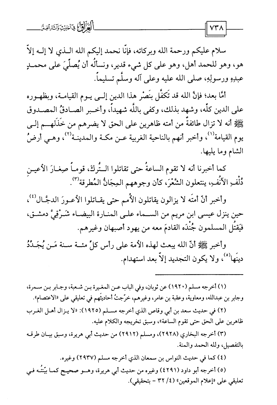 أمَّا بعد؛ فإنَّ الله قد تَكفَّل بنَصْر هذا الدين إلى يوم القيامة، وبظهوره على الدين كلِّه، وشهد بذلك، وكفى باللَّه شهيداً، وأخبر الصادقُ المصدوق صلى الله عليه وسلم أنه لا تزال طائفةٌ من أمته ظاهرين على الحق لا يضرهم من خَذَلهم إلى يوم القيامة (¬1) ، وأخبر أنهم بالناحية الغربية عن مكة والمدينة (¬2) ، وهي أرضُ الشام وما يليها.