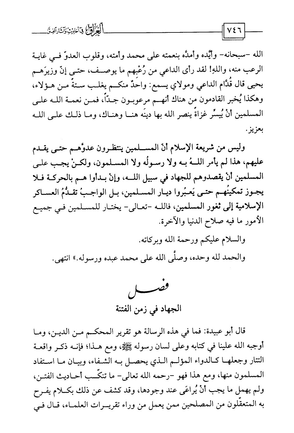 قال أبو عبيدة: فما في هذه الرسالة هو تقرير المحكم من الدين، وما أوجبه الله علينا في كتابه وعلى لسان رسوله صلى الله عليه وسلم، ومع هذا؛ فإنه ذكر واقعة التتار وجعلها كالدواء المؤلم الذي يحصل به الشفاء، وبيان ما استفاد المسلمون منها، ومع هذا فهو -رحمه الله تعالى- ما تنكّب أحاديث الفتن، ولم يهمل ما يجب أنْ يُراعَى عند وجودها، وقد كشف عن ذلك بكلام يفرح به المتعقّلون من المصلحين ممن يعمل من وراء تقريرات العلماء، قال في