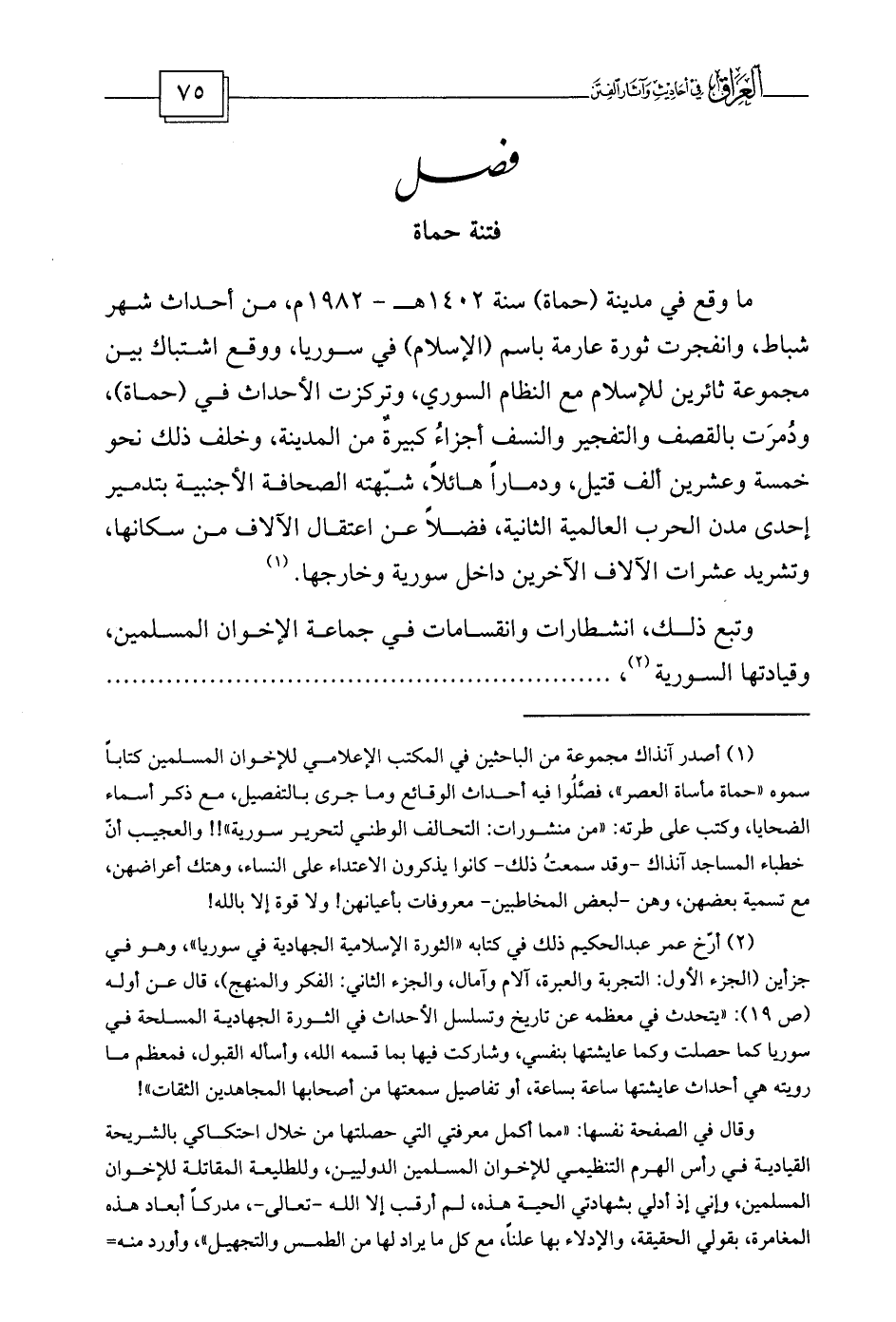 (¬1) أصدر آنذاك مجموعة من الباحثين في المكتب الإعلامي للإخوان المسلمين كتاباً سموه «حماة مأساة العصر» ، فصَّلُوا فيه أحداث الوقائع وما جرى بالتفصيل، مع ذكر أسماء الضحايا، وكتب على طرته: «من منشورات: التحالف الوطني لتحرير سورية» !! والعجيب أنّ خطباء المساجد آنذاك -وقد سمعتُ ذلك- كانوا يذكرون الاعتداء على النساء، وهتك أعراضهن، مع تسمية بعضهن، وهن -لبعض المخاطبين- معروفات بأعيانهن! ولا قوة إلا بالله!
