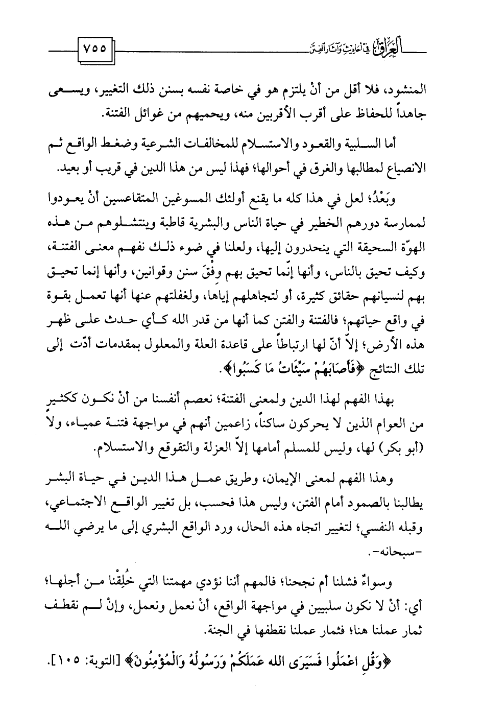 بهذا الفهم لهذا الدين ولمعنى الفتنة؛ نعصم أنفسنا من أنْ نكون ككثيرٍ من العوام الذين لا يحركون ساكناً، زاعمين أنهم في مواجهة فتنة عمياء، ولا (أبو بكر) لها، وليس للمسلم أمامها إلاّ العزلة والتقوقع والاستسلام.