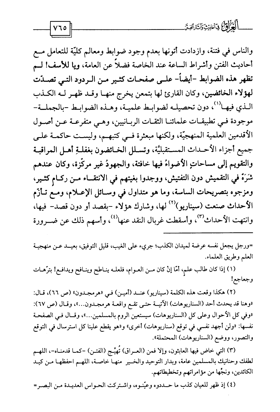 والناس في فتنة، وازدادت أتونها بعدم وجود ضوابط ومعالم كليّة للتعامل مع أحاديث الفتن وأشراط الساعة عند الخاصة فضلاً عن العامة، ويا للأسف! لم تظهر هذه الضوابط -أيضاً- على صفحات كثير من الردود التي تصدّت لهؤلاء الخائضين، وكان القارئ لها بتمعن يخرج منها وقد ظهر له الكذب الذي فيها (¬1) ، دون تحصيله لضوابط علمية، وهذه الضوابط -بالجملة- موجودة في تطبيقات علمائنا الثقات الربانيين، وهي متفرعة عن أصول الأقدمين العلمية المنهجيّة، ولكنها مبعثرة في كتبهم، وليست حاكمة على جميع أجزاء الأحداث المستقبليَّة، وتسلل الخائضون بغفلةِ أهل المراقبة والتقويم إلى مساحاتٍ الأضواءُ فيها خافتة، والجهودُ غير مركّزة، وكان عندهم شَرَهٌ في التقميش دون التفتيش، ووجدوا بغيتهم في الانتقاء من ركامٍ كثير، ومزجوه بتصريحات الساسة، وما هو متداول في وسائل الإعلام، ومع تأزّم الأحداث صنعت (سيناريو) (¬2)