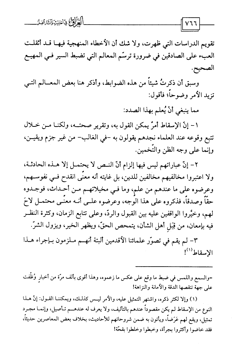 (¬1) وإلا لكثر ذكره، واشتهر التمثيل عليه، والأمر ليس كذلك، ويمكننا القول: إنّ هذا النوع من الإسقاط لم يكن مقصوداً عندهم بالتأليف، ولا يعرف له عندهم تأصيل، وإنما مجرد تمثيل، ويقع لهم عَرَضاً، ويأتون به ضمن شروحاتهم للأحاديث، بخلاف بعض المعاصرين حديثاً، فقد خاضوا وأكثروا بجرأة، وخبطوا وخلطوا بقحّة!