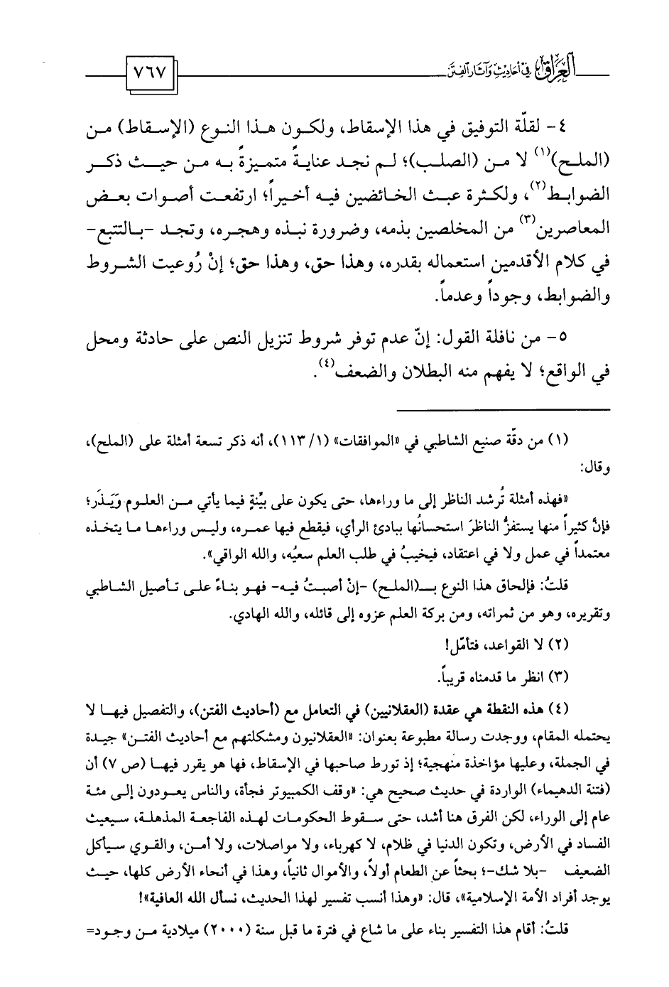 4- لقلّة التوفيق في هذا الإسقاط، ولكون هذا النوع (الإسقاط) من (الملح) (¬1) لا من (الصلب) ؛ لم نجد عنايةً متميزةً به من حيث ذكر الضوابط (¬2) ، ولكثرة عبث الخائضين فيه أخيراً؛ ارتفعت أصوات بعض المعاصرين (¬3) من المخلصين بذمه، وضرورة نبذه وهجره، وتجد -بالتتبع- في كلام الأقدمين استعماله بقدره، وهذا حق، وهذا حق؛ إنْ رُوعيت الشروط والضوابط، وجوداً وعدماً.