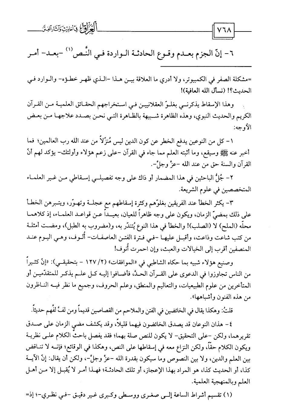 4- هذان النوعان قد يصدق الخائضون فيهما قليلاً، وقد يكشف مضي الزمان على صدق تقريرهما، ولكن -على التحقيق- لا يكون للنص صلة بهما؛ فقد يفصل باحثٌ الكلام على نظرية ويكون الكلام حقّاً، ولكن النزاع معه في إسقاطها على النص، وهكذا في الوقائع؛ فإنه لا تناقض بين العلم والدين، ولا بين النصوص وما سيكون بقدرة الله -عزَّ وجلَّ-، ولكن أن يقال: إنّ الآية كذا، أو الحديث كذا، هو المراد بهذا الإعجاز، أو تلك الحادثة؛ فهذا أمر لا يُقبل إلا من أهل العلم وبالمنهجية العلمية.