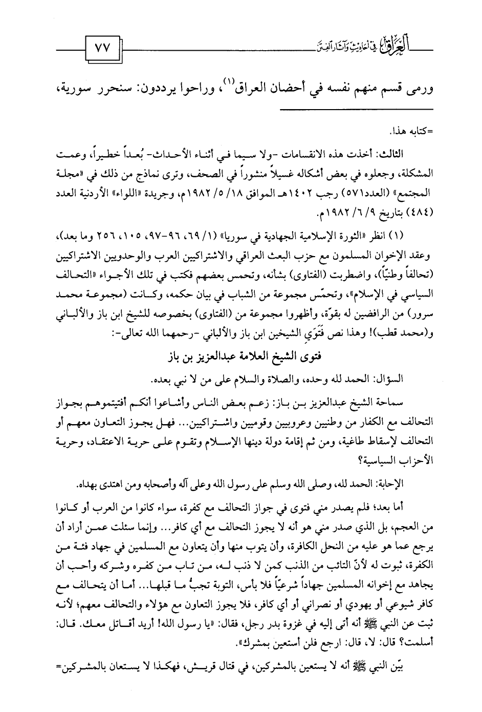 (¬1) انظر «الثورة الإسلامية الجهادية في سوريا» (1/69، 96-97، 105، 256 وما بعد) ، وعقد الإخوان المسلمون مع حزب البعث العراقي والاشتراكيين العرب والوحدويين الاشتراكيين (تحالفاً وطنيّاً) ، واضطربت (الفتاوى) بشأنه، وتحمس بعضهم فكتب في تلك الأجواء «التحالف السياسي في الإسلام» ، وتحمّس مجموعة من الشباب في بيان حكمه، وكانت (مجموعة محمد سرور) من الرافضين له بقوّة، وأظهروا مجموعة من (الفتاوى) بخصوصه للشيخ ابن باز والألباني و (محمد قطب) ! وهذا نص فَتَوَيِ الشيخين ابن باز والألباني -رحمهما الله تعالى-: