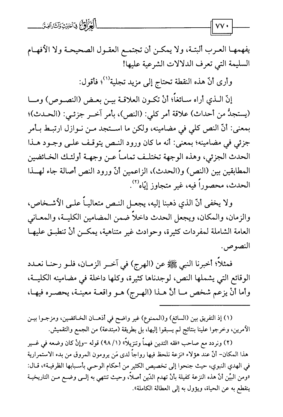 إنّ الذي أراه سائغاً؛ أنْ تكون العلاقة بين بعض (النصوص) وما (يستجدُّ من أحداث) علاقة أمر كلي: (النص) ، بأمر آخر جزئي: (الحدث) ؛ بمعنى: أنّ النص كلي في مضامينه، ولكن ما استجد من نوازل ارتبط بأمر جزئي في مضامينه؛ بمعنى: أنه ما كان ورود النص يتوقف على وجود هذا الحدث الجزئي، وهذه الوجهة تختلف تماماً عن وجهة أولئك الخائضين المطابقين بين (النص) و (الحدث) ، الزاعمين أنّ ورود النص أصالة جاء لهذا الحدث، محصوراً فيه، غير متجاوز إيّاه (¬2) .