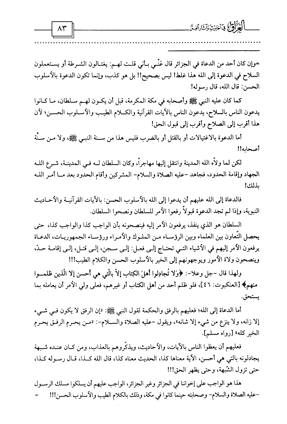 = وإن كان أحد من الدعاة في الجزائر قال عَنِّي بأني قلت لهم: يغتالون الشرطة أو يستعملون السلاح في الدعوة إلى الله هذا غلط! ليس بصحيح!! بل هو كذب، وإنما تكون الدعوة بالأسلوب الحسن: قال الله، قال رسوله!
