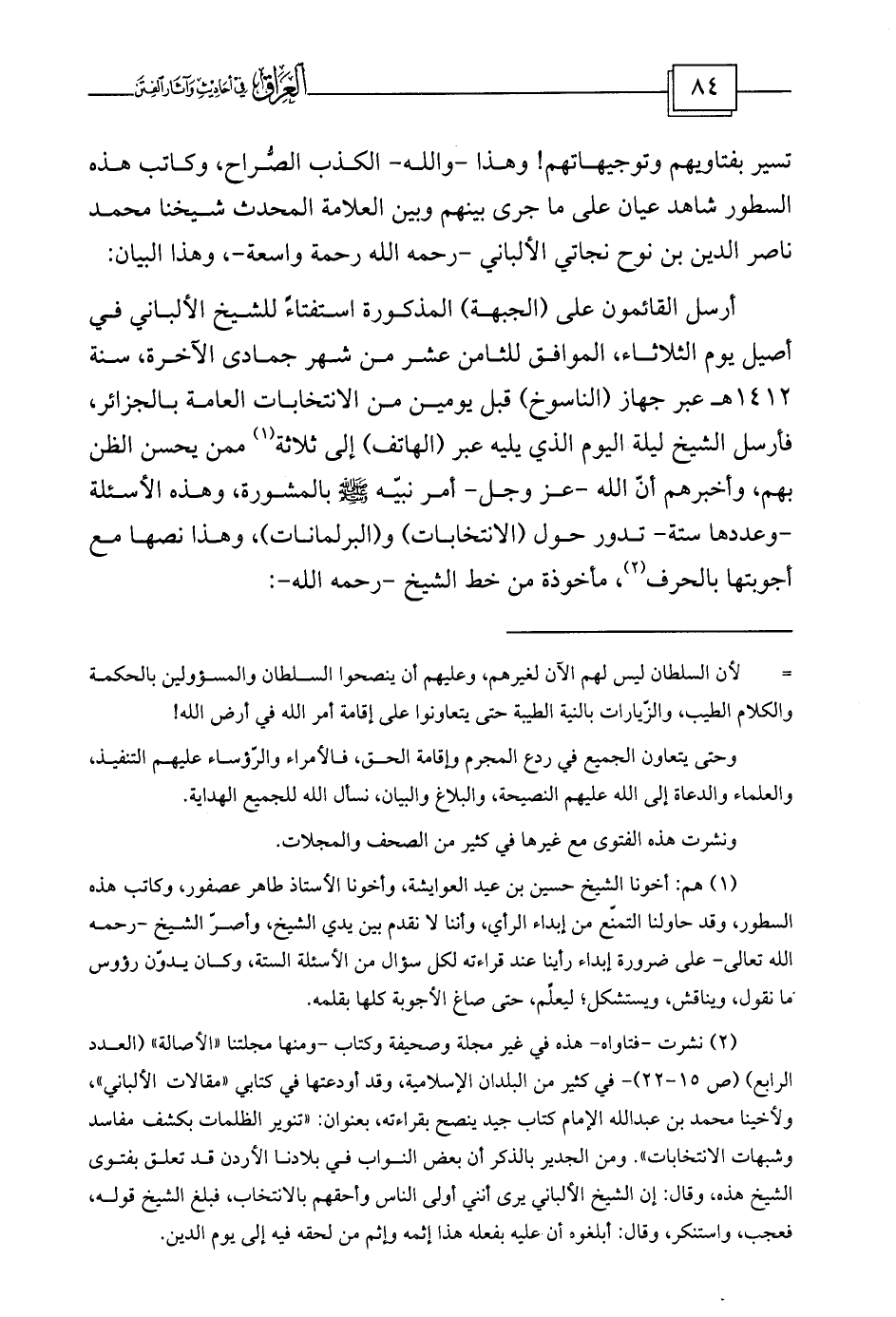 (¬2) نشرت -فتاواه- هذه في غير مجلة وصحيفة وكتاب -ومنها مجلتنا «الأصالة» (العدد الرابع) (ص 15-22) - في كثير من البلدان الإسلامية، وقد أودعتها في كتابي «مقالات الألباني» ، ولأخينا محمد بن عبد الله الإمام كتاب جيد ينصح بقراءته، بعنوان: «تنوير الظلمات بكشف مفاسد وشبهات الانتخابات» . ومن الجدير بالذكر أن بعض النواب في بلادنا الأردن قد تعلق بفتوى الشيخ هذه، وقال: إن الشيخ الألباني يرى أنني أولى الناس وأحقهم بالانتخاب، فبلغ الشيخ قوله، فعجب، واستنكر، وقال: أبلغوه أن عليه بفعله هذا إثمه وإثم من لحقه فيه إلى يوم الدين.