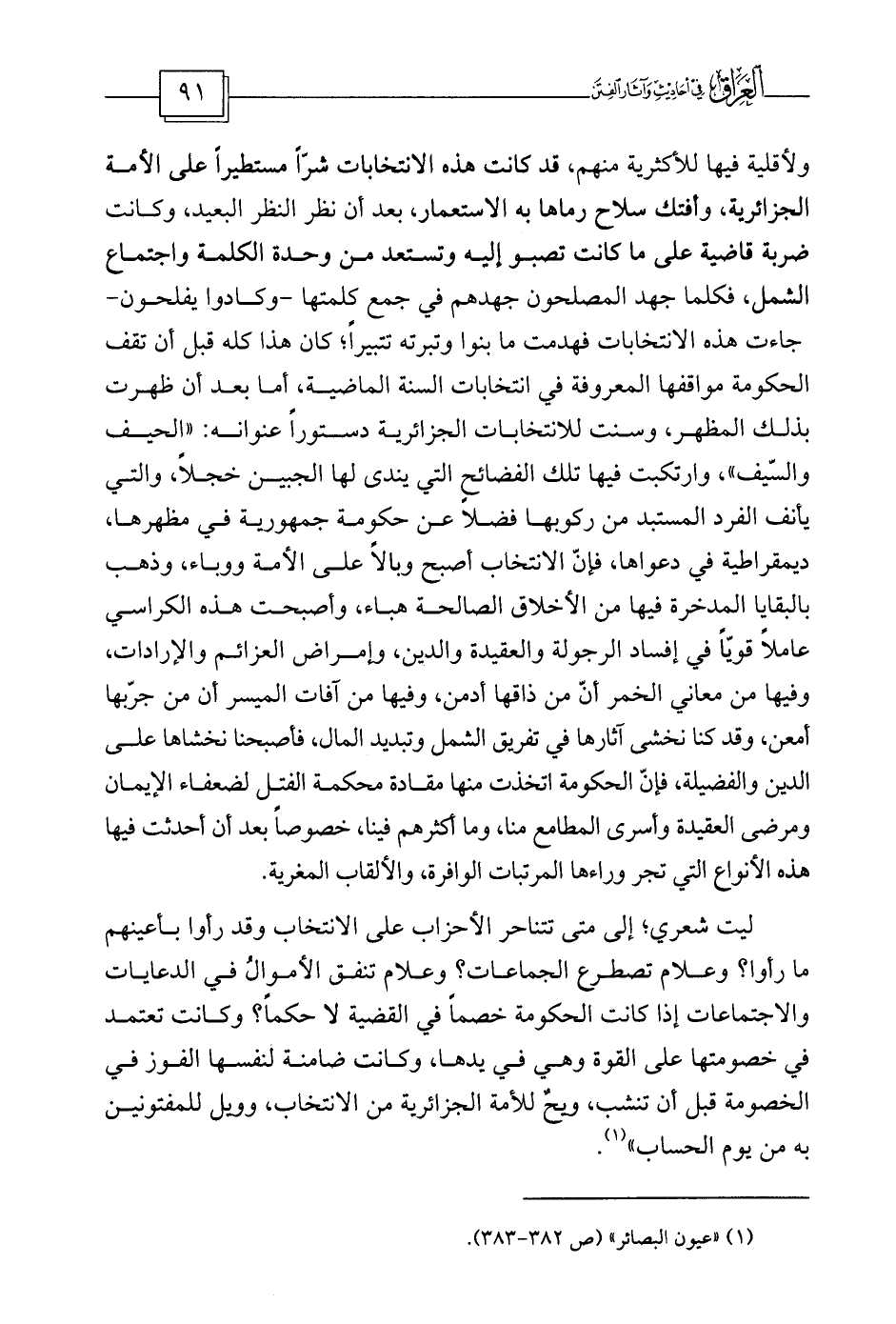 ولأقلية فيها للأكثرية منهم، قد كانت هذه الانتخابات شرّاً مستطيراً على الأمة الجزائرية، وأفتك سلاح رماها به الاستعمار، بعد أن نظر النظر البعيد، وكانت ضربة قاضية على ما كانت تصبو إليه وتستعد من وحدة الكلمة واجتماع الشمل، فكلما جهد المصلحون جهدهم في جمع كلمتها -وكادوا يفلحون- جاءت هذه الانتخابات فهدمت ما بنوا وتبرته تتبيراً؛ كان هذا كله قبل أن تقف الحكومة مواقفها المعروفة في انتخابات السنة الماضية، أما بعد أن ظهرت بذلك المظهر، وسنت للانتخابات الجزائرية دستوراً عنوانه: «الحيف والسّيف» ، وارتكبت فيها تلك الفضائح التي يندى لها الجبين خجلاً، والتي يأنف الفرد المستبد من ركوبها فضلاً عن حكومة جمهورية في مظهرها، ديمقراطية في دعواها، فإنّ الانتخاب أصبح وبالاً على الأمة ووباء، وذهب بالبقايا المدخرة فيها من الأخلاق الصالحة هباء، وأصبحت هذه الكراسي عاملاً قويّاً في إفساد الرجولة والعقيدة والدين، وإمراض العزائم والإرادات، وفيها من معاني الخمر أنّ من ذاقها أدمن، وفيها من آفات الميسر أن من جرّبها أمعن، وقد كنا نخشى آثارها في تفريق الشمل وتبديد المال، فأصبحنا نخشاها على الدين والفضيلة، فإنّ الحكومة اتخذت منها مقادة محكمة الفتل لضعفاء الإيمان ومرضى العقيدة وأسرى المطامع منا، وما أكثرهم فينا، خصوصاً بعد أن أحدثت فيها هذه الأنواع التي تجر وراءها المرتبات الوافرة، والألقاب المغرية.