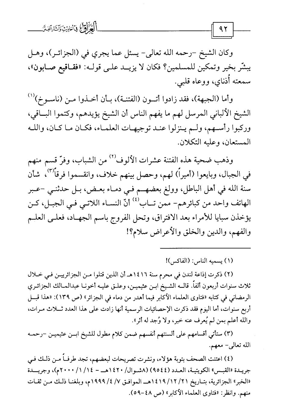 (¬2) ذكرت إذاعة لندن في محرم سنة 1416هـ أن الذين قتلوا من الجزائريين في خلال ثلاث سنوات أربعون ألفاً. قاله الشيخ ابن عثيمين، وعلق عليه أخونا عبد المالك الجزائري الرمضاني في كتابه «فتاوى العلماء الأكابر فيما أهدر من دماء في الجزائر» (ص 139) : «هذا قبل أربع سنوات، أما اليوم فقد ذكرت الإحصائيات الرسمية أنها زادت على هذا العدد ثلاث مرات، والله أعلم بمن لم يُعرف عنه خبر، ولا وُجد له أثر» .