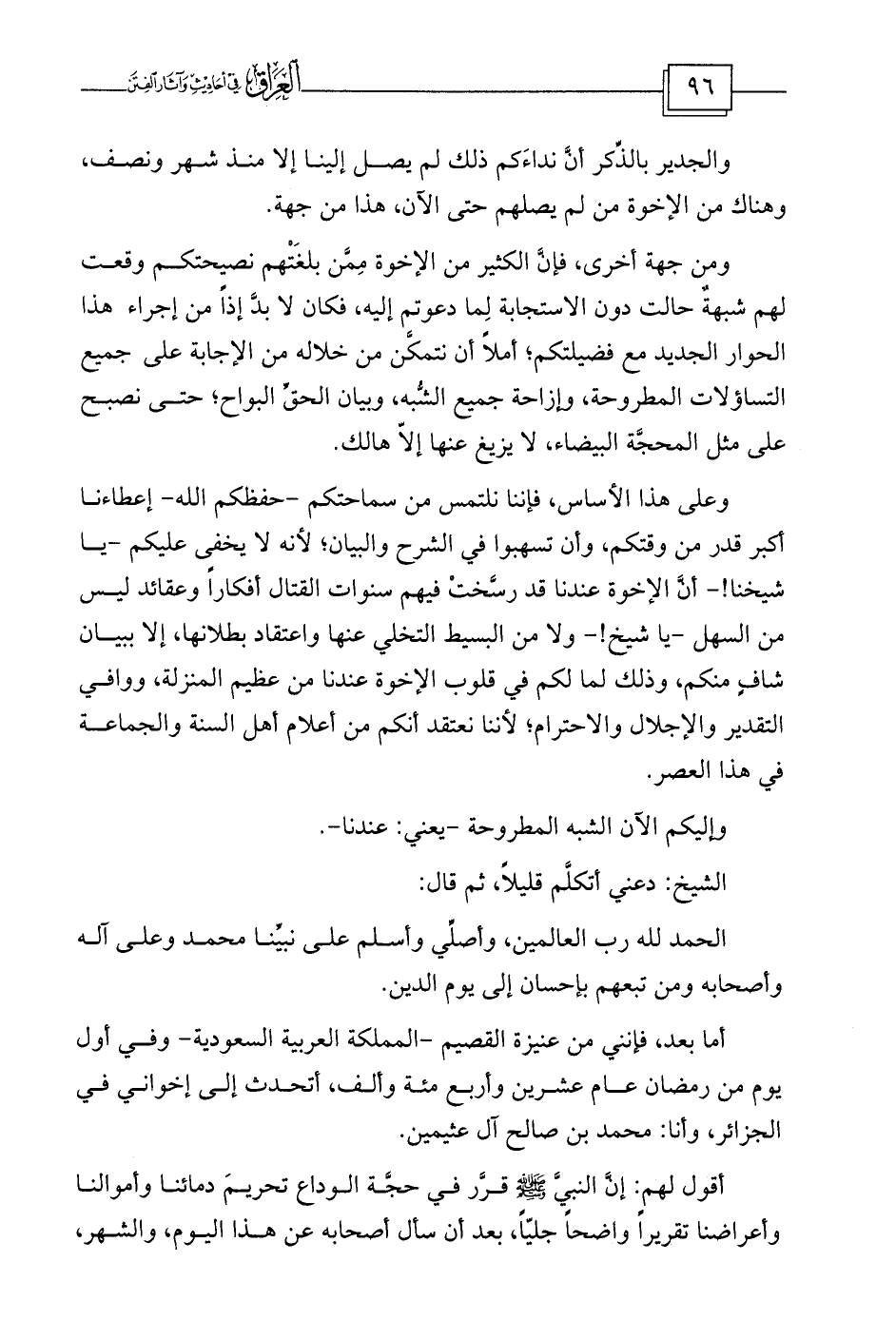 أما بعد، فإنني من عنيزة القصيم -المملكة العربية السعودية- وفي أول يوم من رمضان عام عشرين وأربع مئة وألف، أتحدث إلى إخواني في الجزائر، وأنا: محمد بن صالح آل عثيمين.